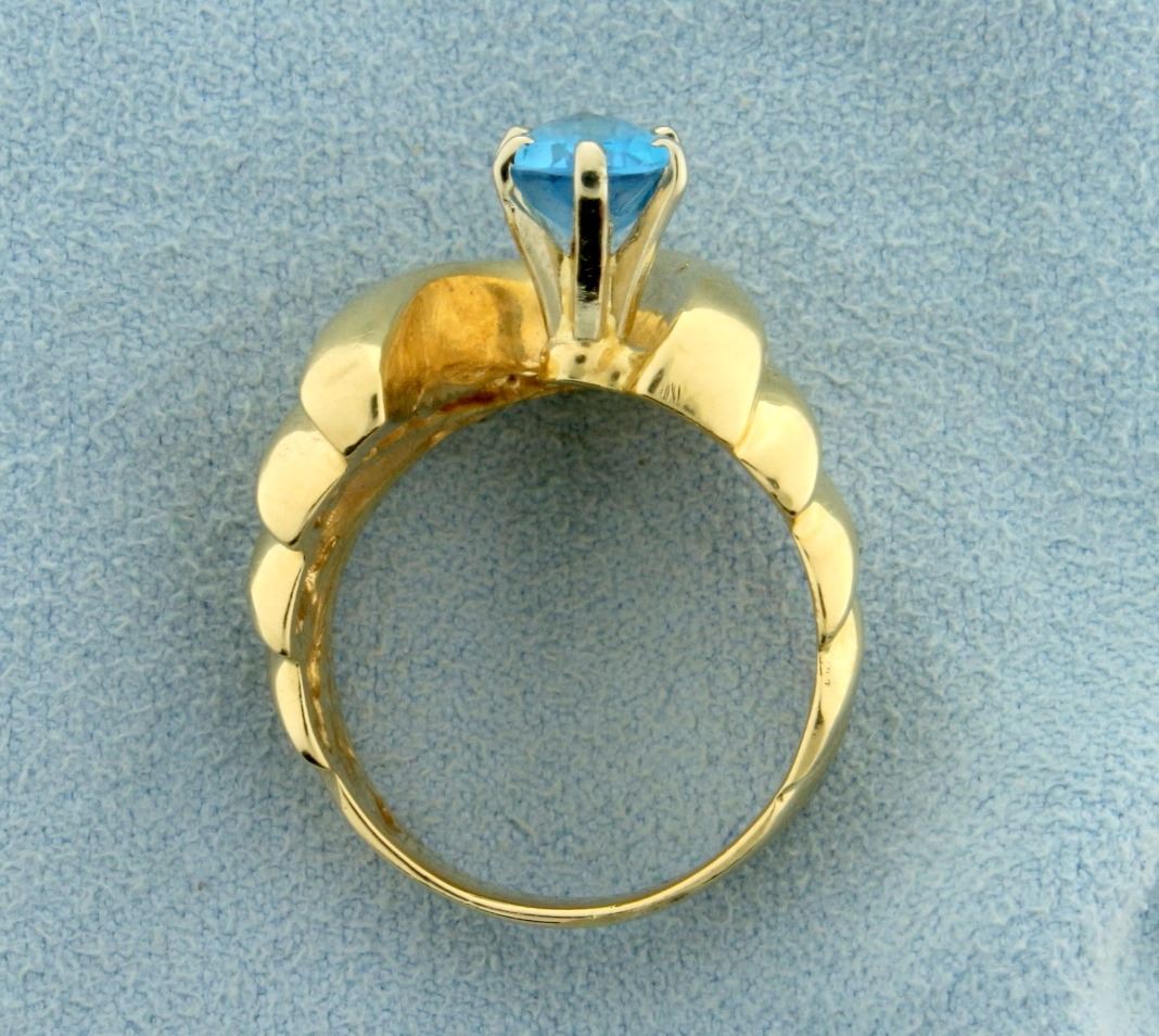 In 14k yellow gold, containing pear shaped blue topaz has excellent color and clarity. Size 7 1/2. 8.1g.
