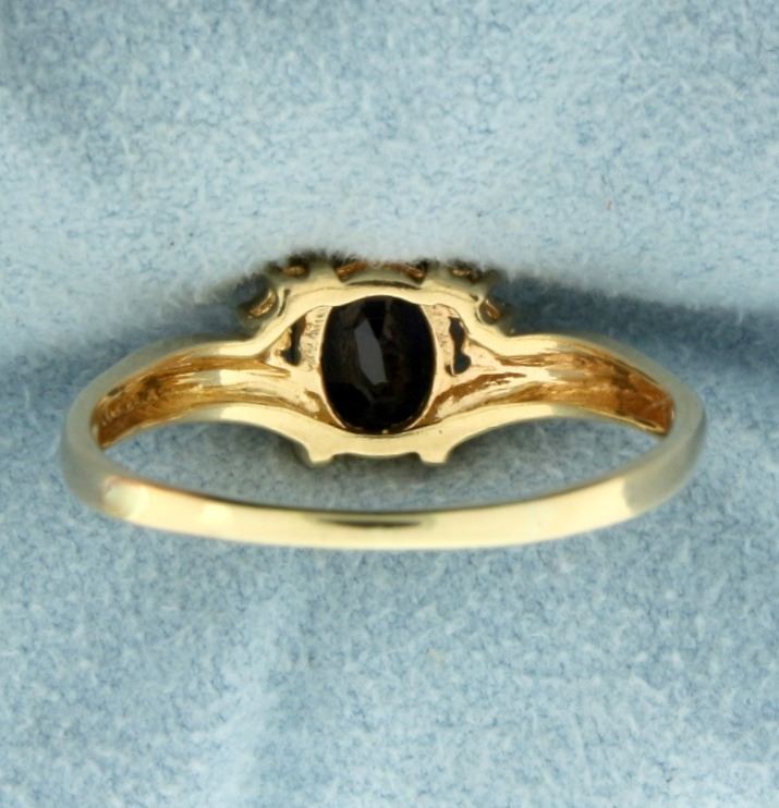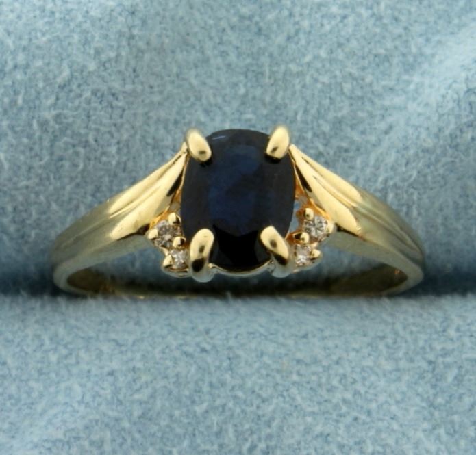 In 14k yellow gold. Contains a natural 8x6mm oval shaped deep blue colored natural sapphire. Also contains four high quality .01ct diamonds, SI clarity/H color. Size 10. 2.9g.