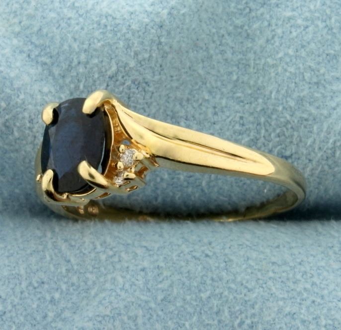 In 14k yellow gold. Contains a natural 8x6mm oval shaped deep blue colored natural sapphire. Also contains four high quality .01ct diamonds, SI clarity/H color. Size 10. 2.9g.