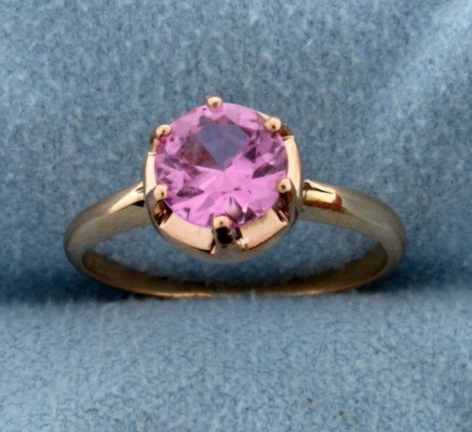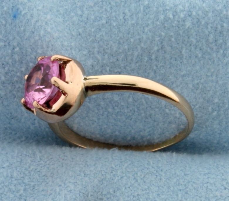 In 14k rose gold. Beautiful 7mm, 1.5 ct natural pink topaz with bright vibrant pink color in a vintage 6 prong setting. Size 6. 2.4g.