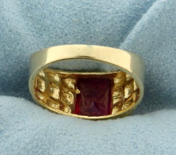 In 14K Yellow and White Gold. Contains an 8x6mm emerald cut Ruby gemstone with beautiful vibrant ruby red color and excellent clarity. Size 4 1/4. 2.9g