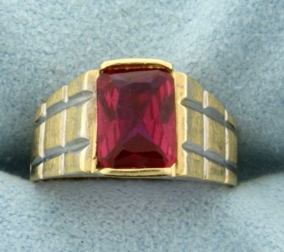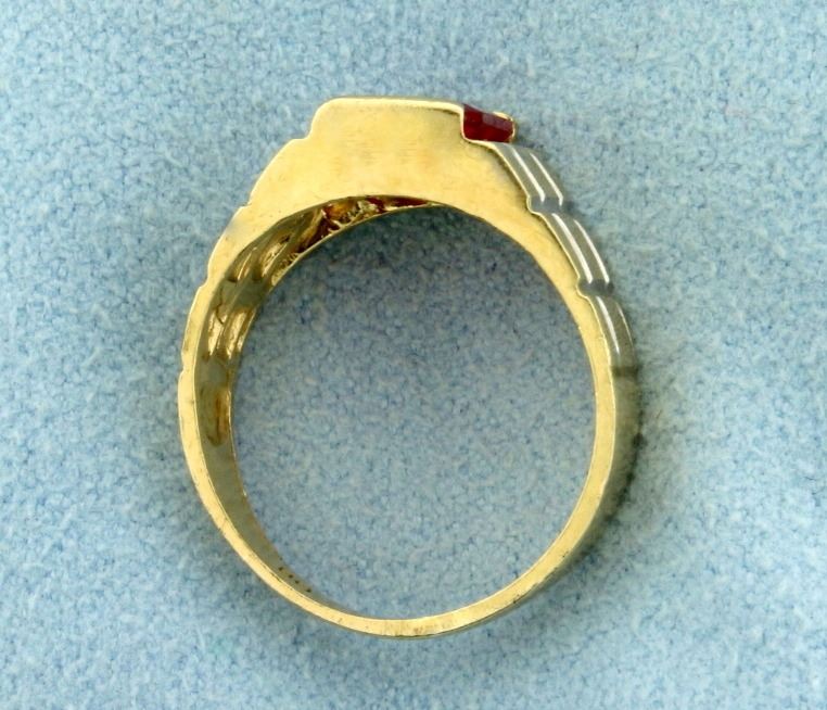 In 14K Yellow and White Gold. Contains an 8x6mm emerald cut Ruby gemstone with beautiful vibrant ruby red color and excellent clarity. Size 4 1/4. 2.9g