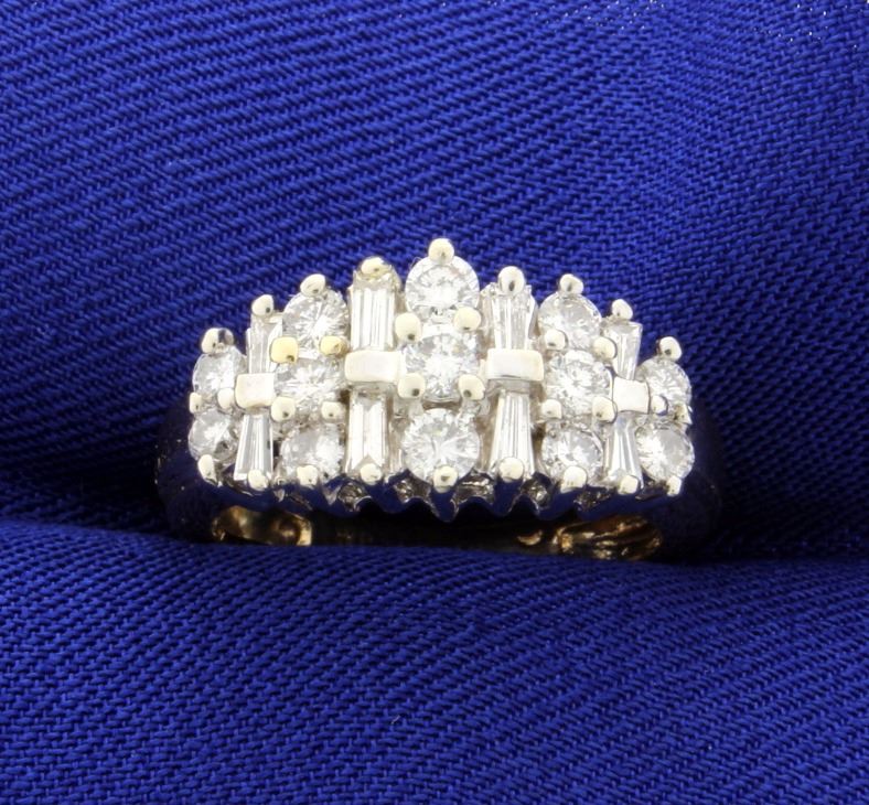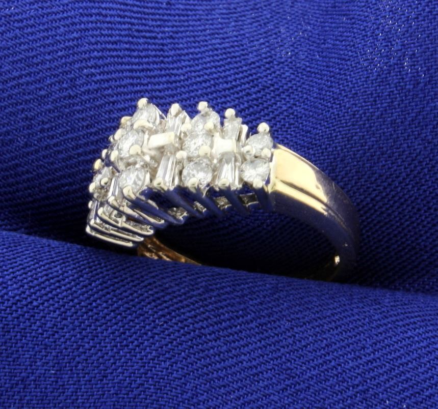 In 14K yellow gold this ring contains 1.5ct total weight of round and baguette diamonds- all high quality VS clarity/G color. Size 5 1/2 4.6g