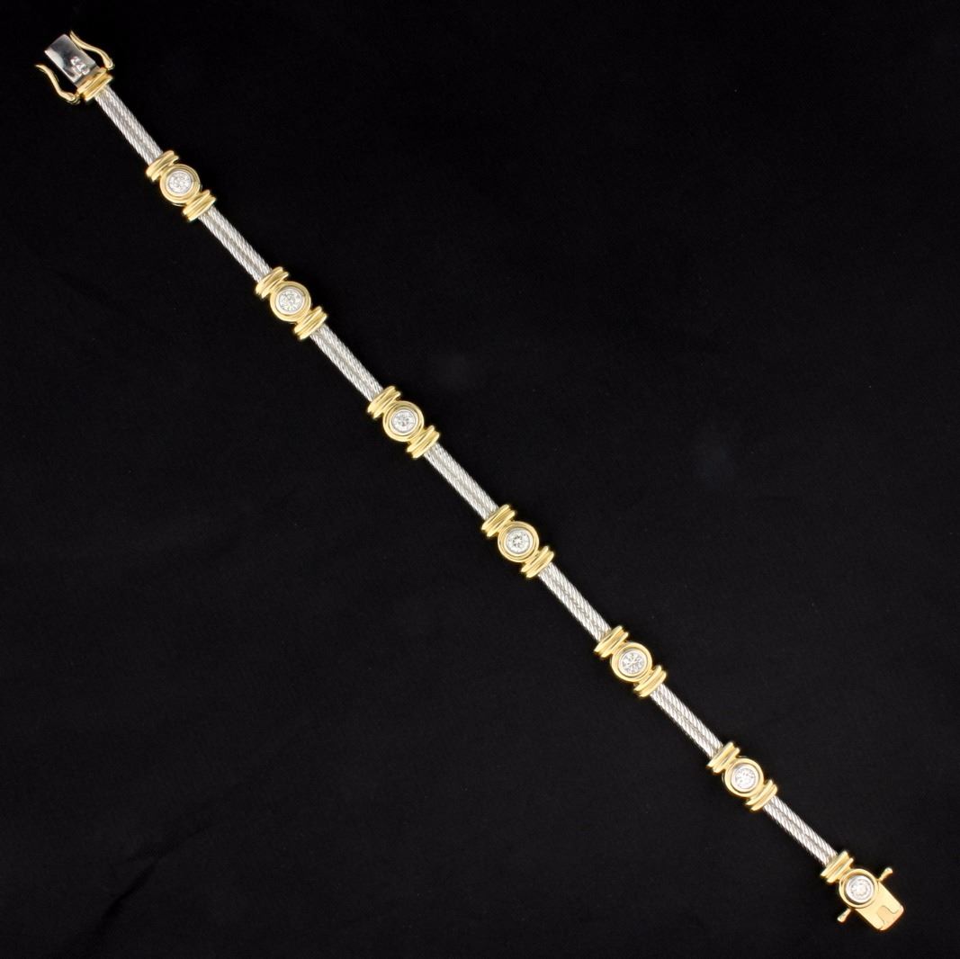 In 14K yellow & white gold, it is 7 3/4 inches long with a safety clasp. It contains seven very high quality .20 to .22ct round diamonds - VS clarity/H color.         21.4g