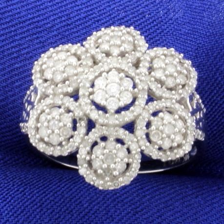 In 14K white gold, there are seven .02ct, forty two .01ct and 144 3/4pt diamonds. For a total weight of over 1.5 cts of round diamonds. Size 10 1/4 5.6g