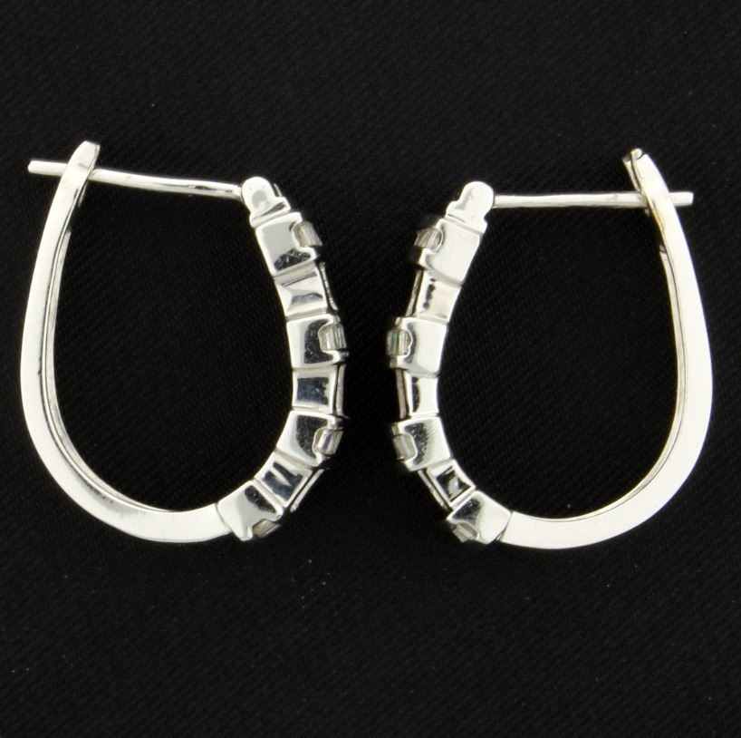 In 10K white gold, they are 3/4 inch long. Each earring contains twelve high quality 1.6mm square diamonds as well as 24 baguette diamonds. 6.6g