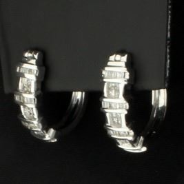 In 10K white gold, they are 3/4 inch long. Each earring contains twelve high quality 1.6mm square diamonds as well as 24 baguette diamonds. 6.6g