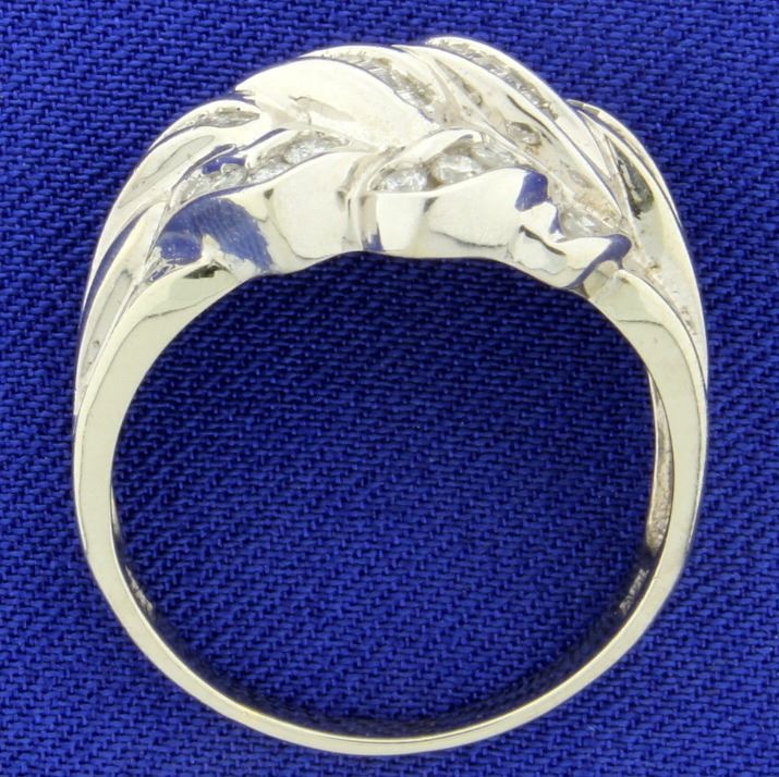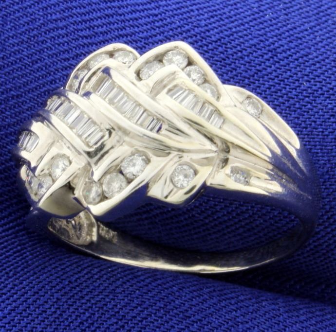 In 10K white gold. This ring contains twenty .03ct of round high quality diamonds, as well as .90ct total weight of high quality baguette diamonds - SI clarity/G color. Size 9 3/4             4.5g