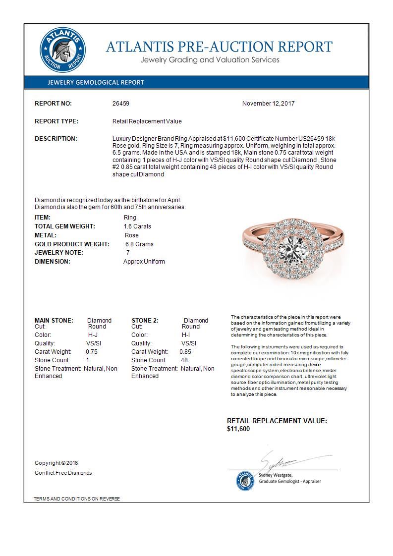 REF-234W4F -26459 ---- 1.6 CTW Certified VS/SI Diamond Solitaire Halo Ring 18K Rose Gold ---- Luxury Designer Brand Ring Appraised at $11,600 Certificate Number US26459 18k Rose gold, Ring Size is 7, Ring measuring approx. Uniform, weighing in total approx. 6.5 grams. Made in the USA and is stamped 18k, Main stone 0.75 carat total weight containing 1 pieces of H-J color with VS/SI quality Round shape cut Diamond , Stone #2 0.85 carat total weight containing 48 pieces of H-I color with VS/SI quality Round shape cut Diamond