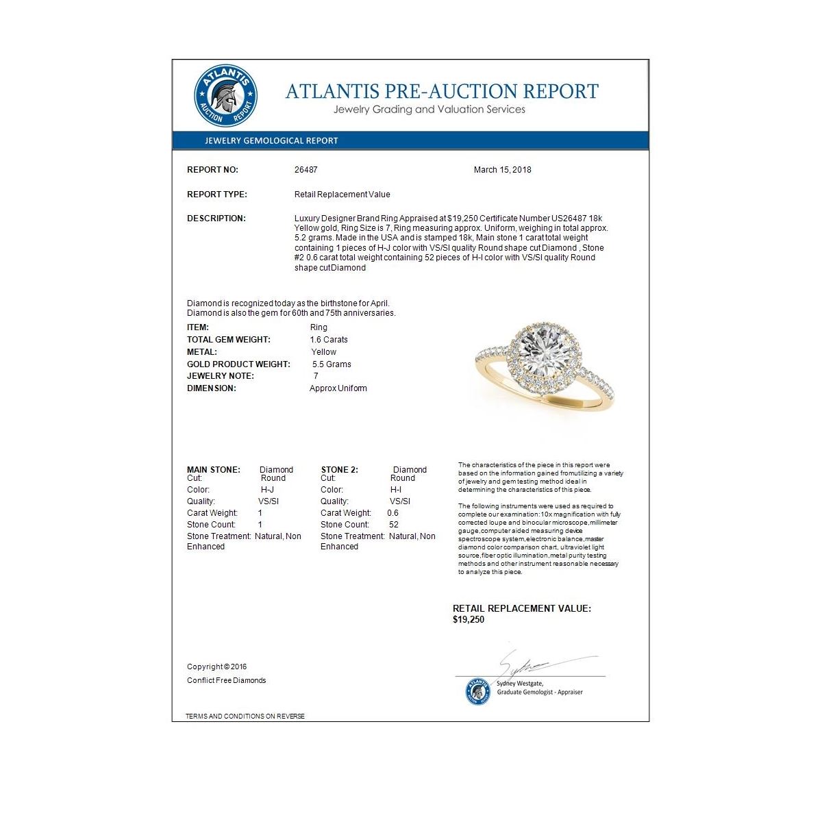 REF-389T3M -26487 ---- 1.6 CTW Certified VS/SI Diamond Solitaire Halo Ring 18K Yellow Gold ---- Luxury Designer Brand Ring Appraised at $19,250 Certificate Number US26487 18k Yellow gold, Ring Size is 7, Ring measuring approx. Uniform, weighing in total approx. 5.2 grams. Made in the USA and is stamped 18k, Main stone 1 carat total weight containing 1 pieces of H-J color with VS/SI quality Round shape cut Diamond , Stone #2 0.6 carat total weight containing 52 pieces of H-I color with VS/SI quality Round shape cut Diamond