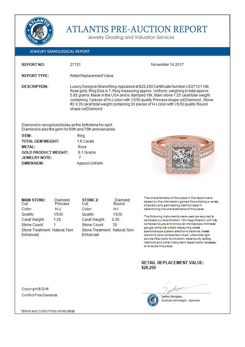 REF-570W9F -27121 ---- 1.6 CTW Certified VS/SI Princess Diamond Solitaire Halo Ring 18K Rose Gold ---- Luxury Designer Brand Ring Appraised at $28,250 Certificate Number US27121 18k Rose gold, Ring Size is 7, Ring measuring approx. Uniform, weighing in total approx. 5.85 grams. Made in the USA and is stamped 18k, Main stone 1.25 carat total weight containing 1 pieces of H-J color with VS/SI quality Princess shape cut Diamond , Stone #2 0.35 carat total weight containing 30 pieces of H-I color with VS/SI quality Round shape cut Diamond