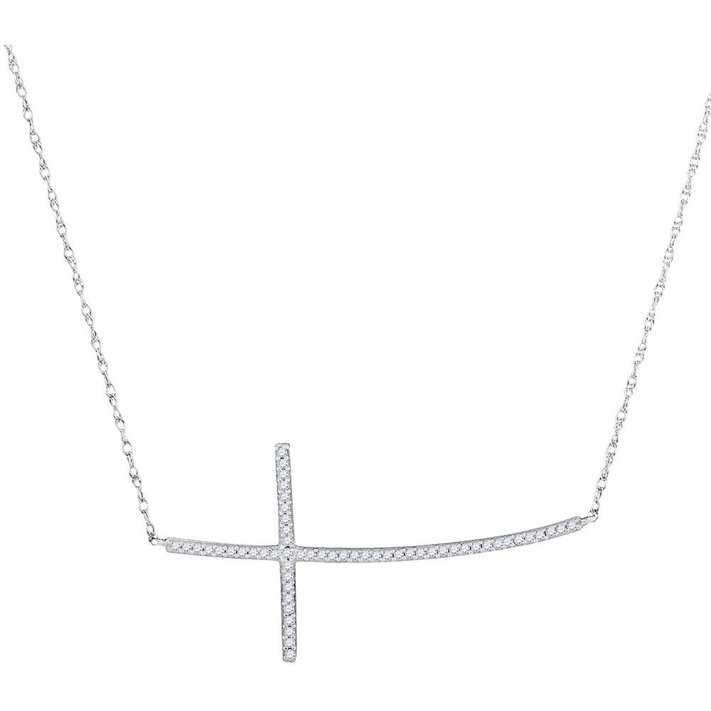 10kt White Gold Womens Round Diamond Horizontal Curved Cross Pendant Necklace 1/6 Cttw