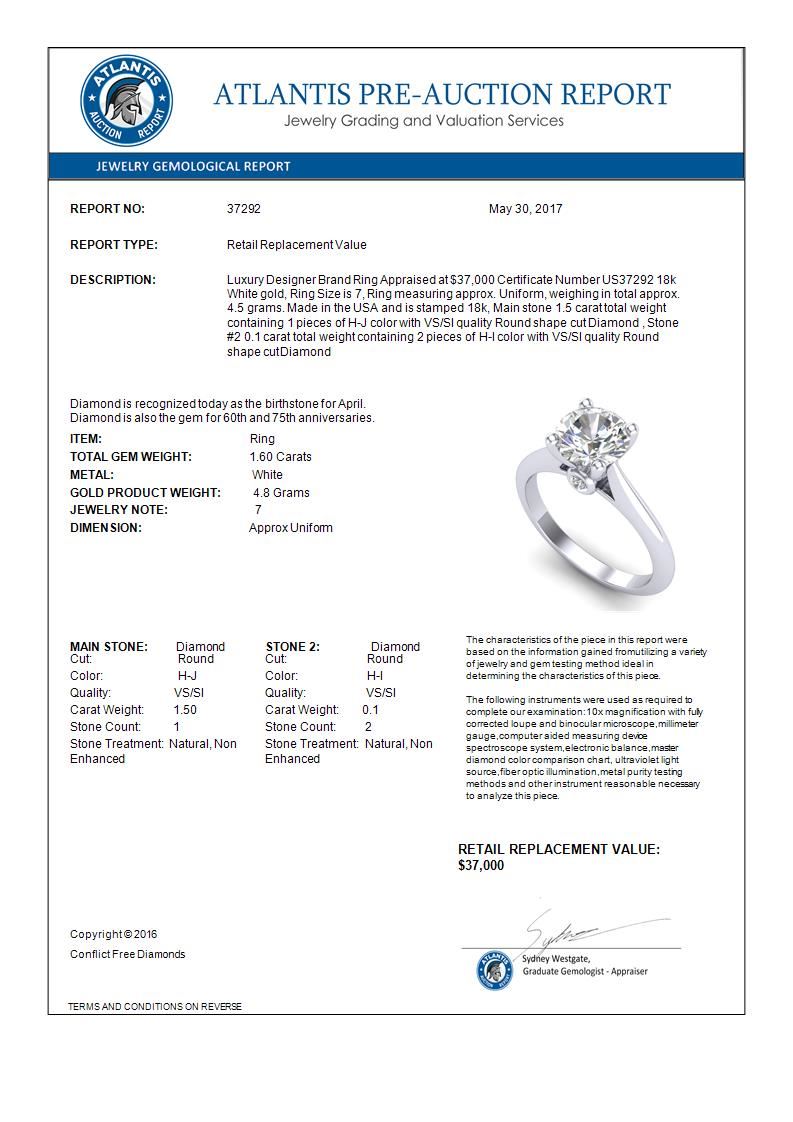 1.6 CTW VS/SI Diamond Art Deco Ring 18K White Gold ---- Luxury Designer Brand Ring Appraised Retail Price at $37,000 ---- SKU Number US37292 18k White gold Ring Size is 7, Ring measuring approx. Uniform, weighing in total approx. 4.5 grams. Made in the USA and is stamped 18k, Main stone 1.50 carat total weight containing 1 pieces of H-J color with VS/SI quality Round shape cut Diamond , Stone #2 0.1 carat total weight containing 2 pieces of H-I color with VS/SI quality Round shape cut