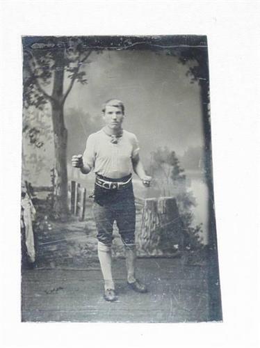 1/6 PLATE TIN TYPE OF MAN W/ FIRE PARADE BELT #4 IN BOXING POSE W/ SCENIC BACKDROP - NO CASE, MINOR SCRATCHES;