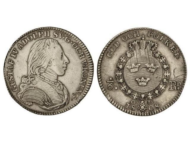 1/6 Riksdaler. 1808-O.L. GUSTAVO ADOLFO IV. AR. (Rayas de ajuste en reverso. Pequeños golpecitos y rayitas). KM-560. (MBC).