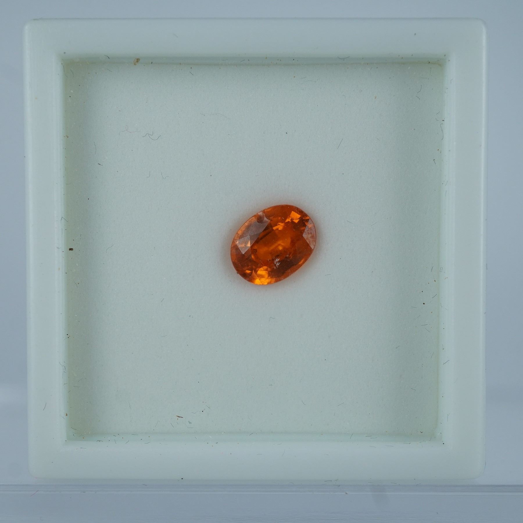 Vibrant spessartite garnet gemstone in an oval cut, showcasing rich orange color and excellent brilliance. Prized for its fiery hue and rarity among garnets, this gem is well-suited for fine custom jewelry. Includes protective display case.
