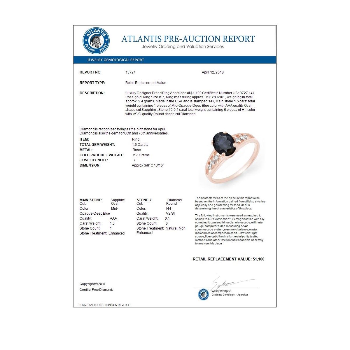 REF-18W5F -13727 ---- 1.60 CTW Blue Sapphire & Diamond Ring 14K Rose Gold ---- Luxury Designer Brand Ring Appraised at $1,100 Certificate Number US13727 14k Rose gold, Ring Size is 7, Ring measuring approx. 3/8" x 13/16" , weighing in total approx. 2.4 grams. Made in the USA and is stamped 14k, Main stone 1.5 carat total weight containing 1 pieces of Mid-Opaque-Deep Blue color with AAA quality Oval shape cut Sapphire , Stone #2 0.1 carat total weight containing 6 pieces of H-I color with VS/SI quality Round shape cut Diamond