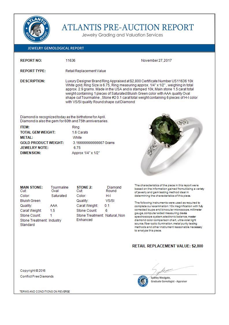 11636 - REF-36M4F ---- 1.60 CTW Green Tourmaline & Diamond Ring 10K White Gold ---- Luxury Designer Brand Ring Appraised at $2,800 Certificate Number US11636 10k White gold, Ring Size is 6.75, Ring measuring approx. 1/4" x 1/2" , weighing in total approx. 2.9 grams. Made in the USA and is stamped 10k, Main stone 1.5 carat total weight containing 1 pieces of Saturated Bluish Green color with AAA quality Oval shape cut Tourmaline , Stone #2 0.1 carat total weight containing 6 pieces of H-I color with VS/SI quality Round shape cut Diamond