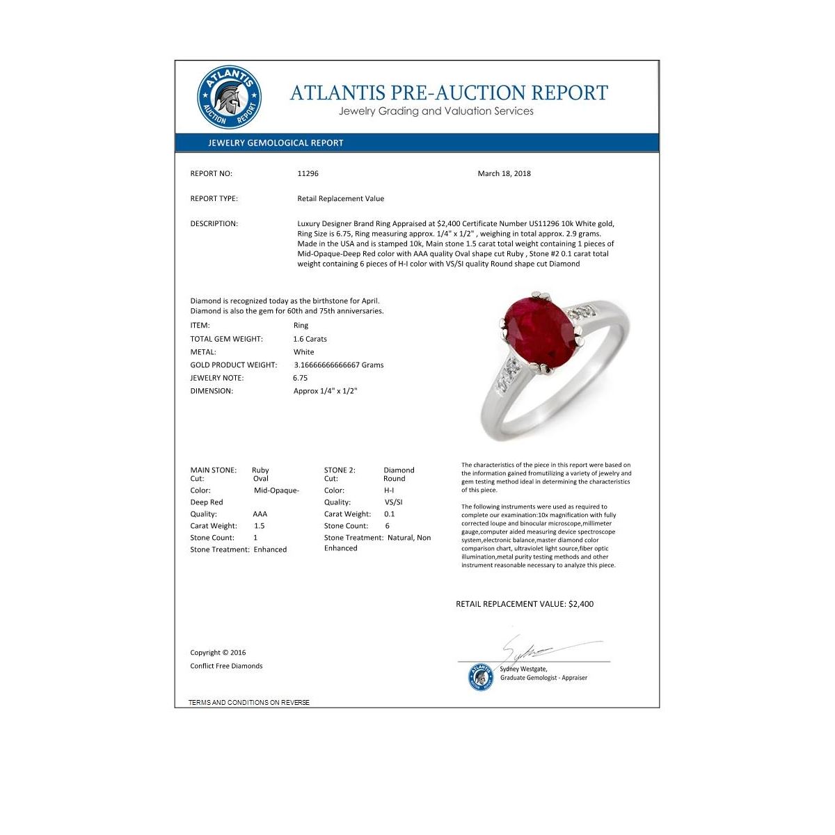 REF-36N4Y -11296 ---- 1.60 CTW Ruby & Diamond Ring 10K White Gold ---- Luxury Designer Brand Ring Appraised at $2,400 Certificate Number US11296 10k White gold, Ring Size is 6.75, Ring measuring approx. 1/4" x 1/2" , weighing in total approx. 2.9 grams. Made in the USA and is stamped 10k, Main stone 1.5 carat total weight containing 1 pieces of Mid-Opaque-Deep Red color with AAA quality Oval shape cut Ruby , Stone #2 0.1 carat total weight containing 6 pieces of H-I color with VS/SI quality Round shape cut Diamond