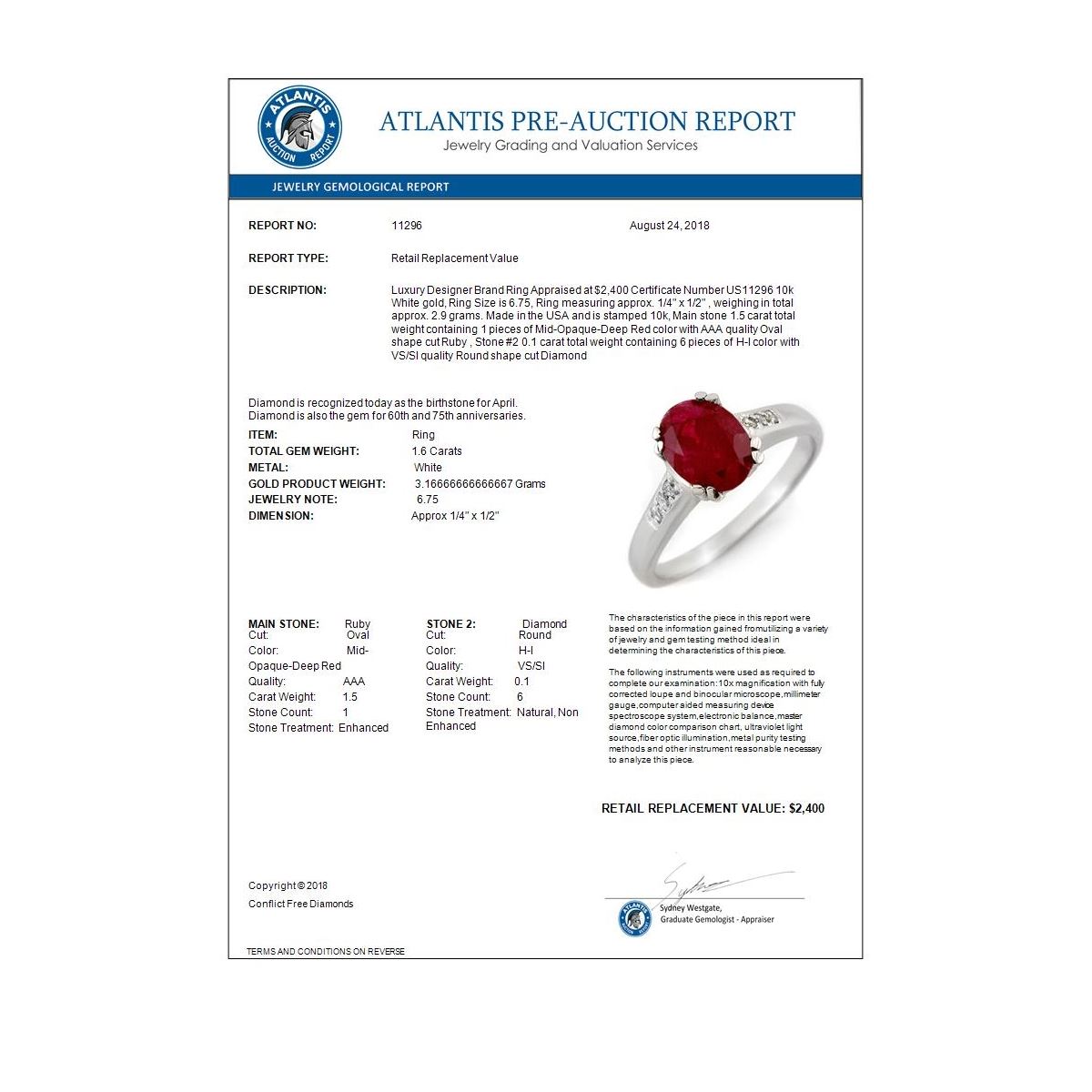 REF-36N4Y -11296 ---- 1.60 CTW Ruby & Diamond Ring 10K White Gold ---- Luxury Designer Brand Ring Appraised at $2,400 Certificate Number US11296 10k White gold, Ring Size is 6.75, Ring measuring approx. 1/4" x 1/2" , weighing in total approx. 2.9 grams. Made in the USA and is stamped 10k, Main stone 1.5 carat total weight containing 1 pieces of Mid-Opaque-Deep Red color with AAA quality Oval shape cut Ruby , Stone #2 0.1 carat total weight containing 6 pieces of H-I color with VS/SI quality Round shape cut Diamond