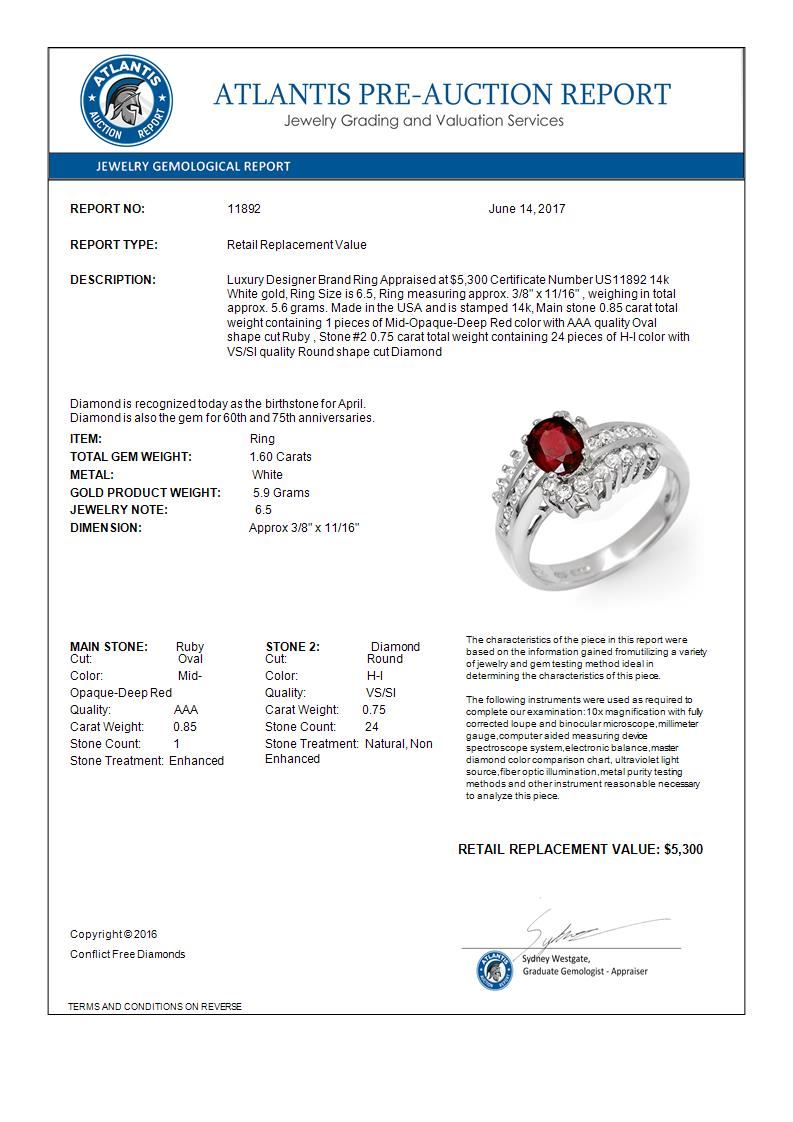 1.60 CTW Ruby & Diamond Ring 14K White Gold ---- Luxury Designer Brand Ring Appraised Retail Price at $5,300 ---- SKU Number US11892 14k White gold Ring Size is 6.5, Ring measuring approx. 3/8" x 11/16" , weighing in total approx. 5.6 grams. Made in the USA and is stamped 14k, Main stone 0.85 carat total weight containing 1 pieces of Mid-Opaque-Deep Red color with AAA quality Oval shape cut Ruby , Stone #2 0.75 carat total weight containing 24 pieces of H-I color with VS/SI quality Round shape cut