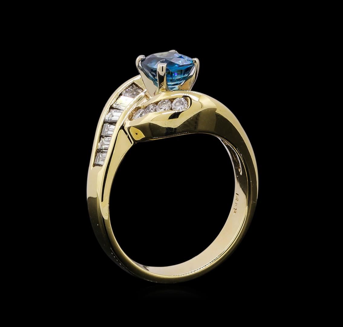 One ring : 14KT yellow gold weighing 7.15gm containing one blue zircon with a total weight of 1.6ct and diamonds weighing 0.8ctw.