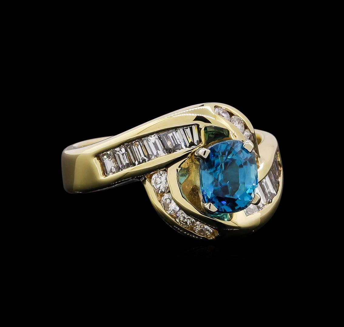 One ring : 14KT yellow gold weighing 7.15gm containing one blue zircon with a total weight of 1.6ct and diamonds weighing 0.8ctw.