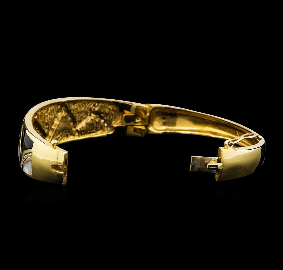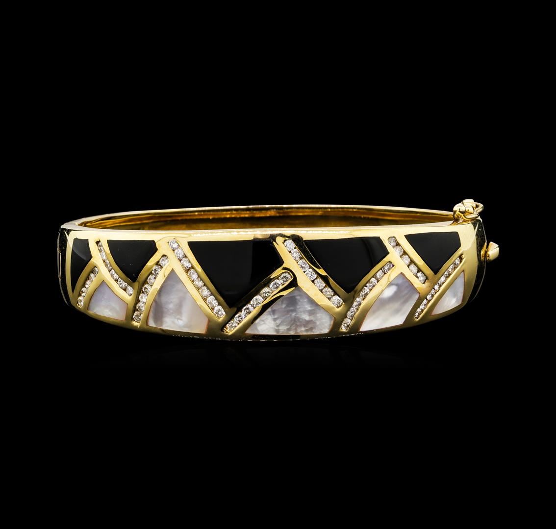 One electronically tested 14KT yellow gold lady's combination cast & assembled fashion bangle bracelet with a tongue clasp with foldover safety with a bright polish finish. The featured lady's bracelet measures approximately six and a half inches in circumference and tapers from seventeen to seven millimeters in width. The bracelet features alternating pieces of inlaid onyx and mother of pearl. Identified with markings of '14K'. Condition is new, good workmanship. Containing: Fifty-Five channel set round brilliant cut diamonds, measuring 2.00 - 1.90 x 1.21mm (depth est.) approximate total weight of 55 Stones = 1.60ct. Graded in the setting. Color H - I Clarity SI-1 to I-1 Cut Good. Total Weight of Diamonds 1.60ct.. Total Weight of Bangle Bracelet 44.60gm GAS Appraised at $12445.00. GAS Appraised at $12,445.00.