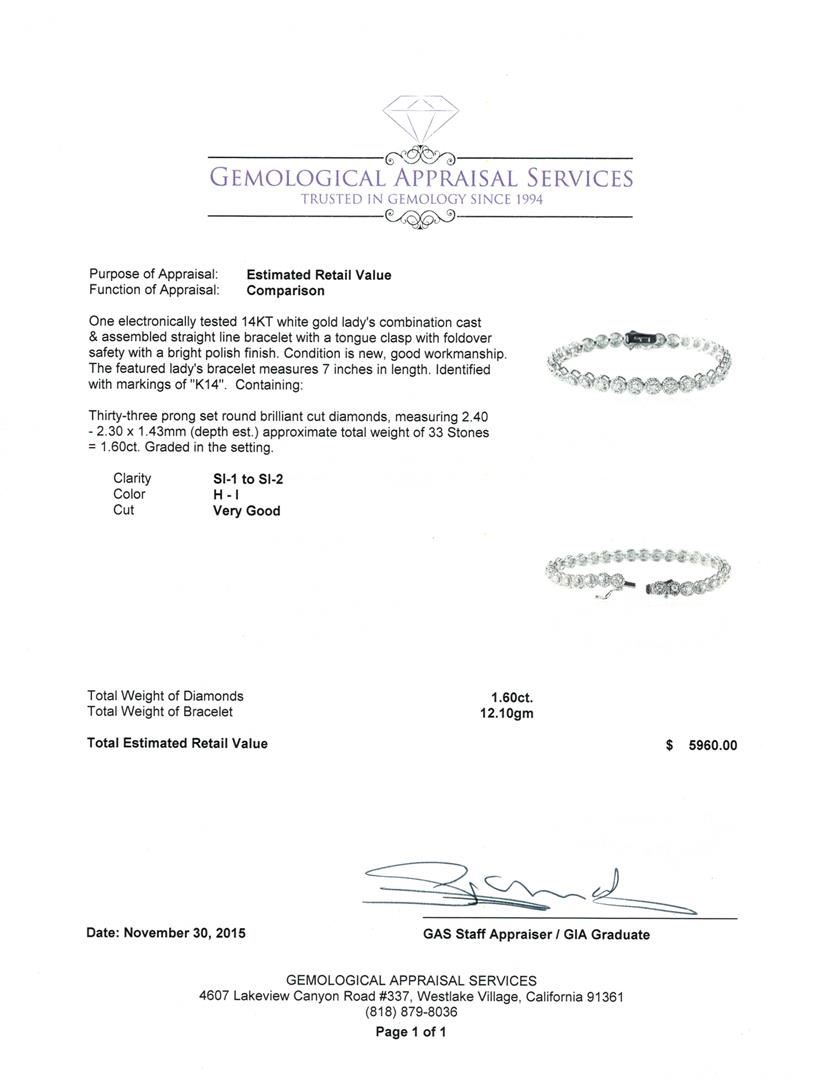 One electronically tested 14KT white gold lady's combination cast & assembled straight line bracelet with a tongue clasp with foldover safety with a bright polish finish. The featured lady's bracelet measures 7 inches in length. Identified with markings of "K14". Condition is new, good workmanship. Containing: Thirty-Three prong set round brilliant cut diamonds, measuring 2.40 - 2.30 x 1.43mm (depth est.) approximate total weight of 33 Stones = 1.60ct. Graded in the setting. Clarity: SI-1 to SI-2 . Color: H - I. Cut Very Good. Total Weight of Diamonds 1.60ct.. Total Weight of Bracelet 12.10gm at $ 5960.00 GAS Appraised.
