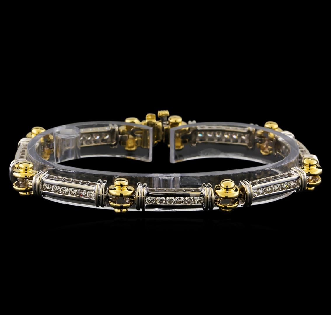 One electronically tested 14KT white and yellow gold lady's combination cast & assembled fashion bar bracelet with a tongue clasp with foldover safety with a bright polish finish. The featured lady's bracelet measures 7 inches in length. Condition is new, good workmanship. Containing: Forty-Two channel set round brilliant cut diamonds, measuring 2.20 - 2.10 x 1.33mm (depth est.) approximate total weight of 42 Stones = 1.60ct. Graded in the setting. Clarity: VS-1 to VS-2. Color: H - I. Cut Good. Total Weight of Diamonds 1.60ct. Total Weight of Bar Bracelet 23.00gm. GAS Appraised at $6,915.00.