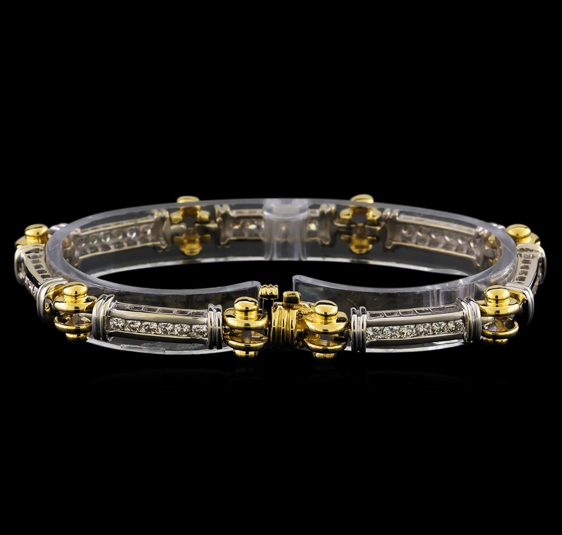 One electronically tested 14KT white and yellow gold lady's combination cast & assembled fashion bar bracelet with a tongue clasp with foldover safety with a bright polish finish. The featured lady's bracelet measures 7 inches in length. Condition is new, good workmanship. Containing: Forty-Two channel set round brilliant cut diamonds, measuring 2.20 - 2.10 x 1.33mm (depth est.) approximate total weight of 42 Stones = 1.60ct. Graded in the setting. Clarity: VS-1 to VS-2. Color: H - I. Cut Good. Total Weight of Diamonds 1.60ct. Total Weight of Bar Bracelet 23.00gm. GAS Appraised at $6,915.00.