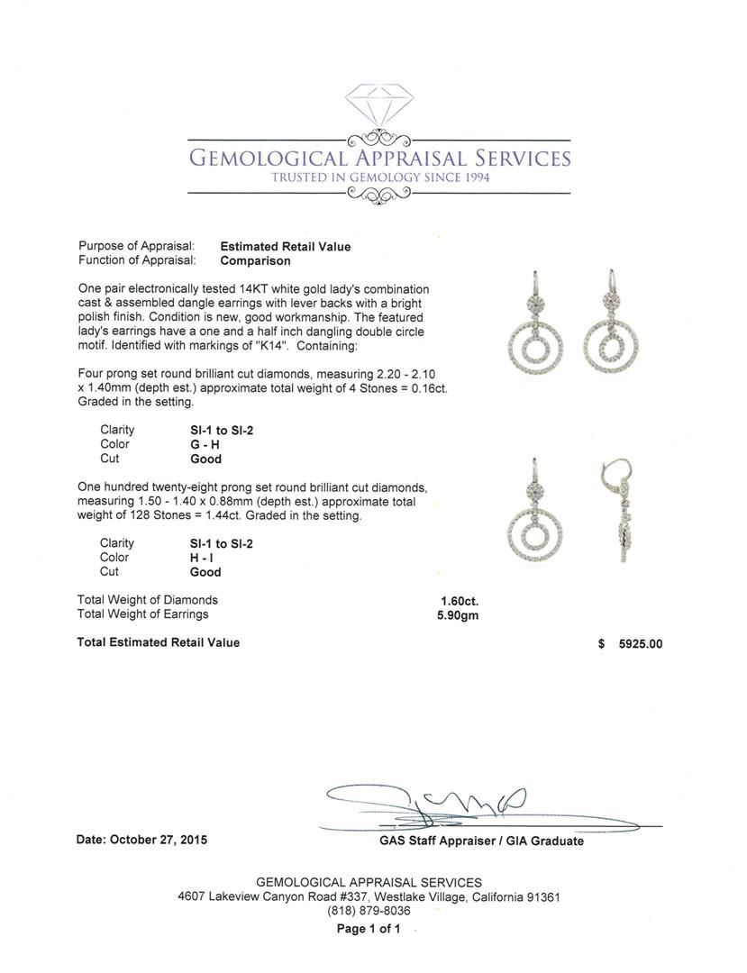 One pair electronically tested 14KT white gold lady's combination cast & assembled dangle earrings with lever backs with a bright polish finish. The featured lady's earrings have a one and a half inch dangling double circle motif. Identified with markings of "K14". Condition is new, good workmanship. Containing: Four prong set round brilliant cut diamonds, measuring 2.20 - 2.10 x 1.40mm (depth est.) approximate total weight of 4 Stones = 0.16ct. Graded in the setting. Clarity: SI-1 to SI-2. Color: G - Good One Hundred Twenty-Eight prong set round brilliant cut diamonds, measuring 1.50 - 1.40 x 0.88mm (depth est.) approximate total weight of 128 Stones = 1.44ct. Graded in the setting. Clarity: SI-1 to SI-2. Color: H - I. Cut Good. Total Weight of Diamonds 1.60ct. Total Weight of Earrings 5.90gm. GAS Appraised at $5,925.00.
