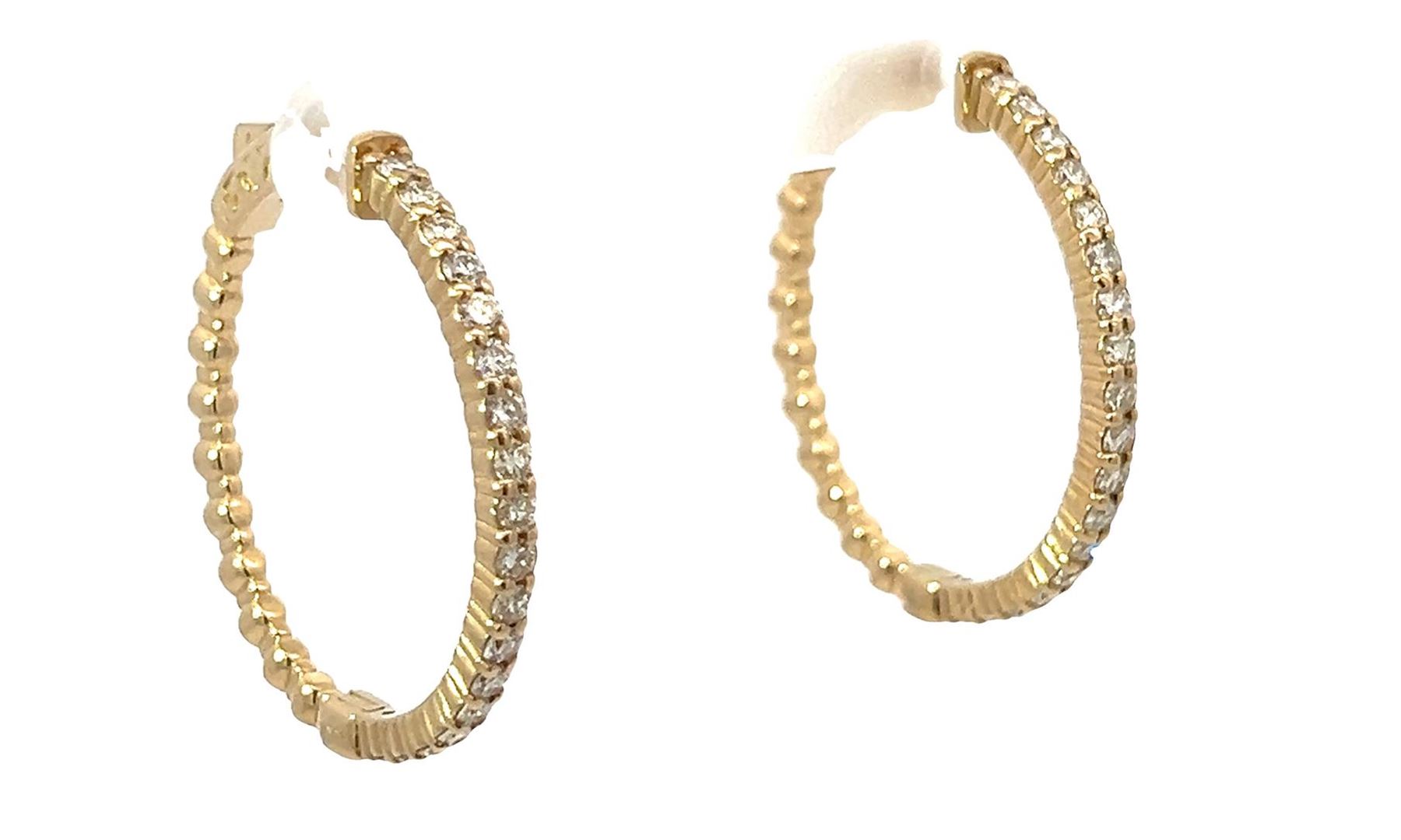 One pair electronically tested 14KT yellow gold lady's combination cast & assembled fashion hoop earrings with hinged, snap locking posts with a bright polish finish. The featured ladies hoop earrings measure 31.5 millimeter in diameter. Identified with markings of "14K". Condition is new, good workmanship. Containing: Thirty-Six prong set round brilliant cut diamonds, measuring 2.30 - 2.10 x 1.41mm (depth est.) approximate total weight of 36 Stones = 1.60ct. Graded in the setting. Color I - K Clarity VVS-2 to SI-1 Cut Very Good Total Weight of Diamonds 1.60ct. Total Weight of Earrings 9.90gm Estimated Retail Value $ 7045.00