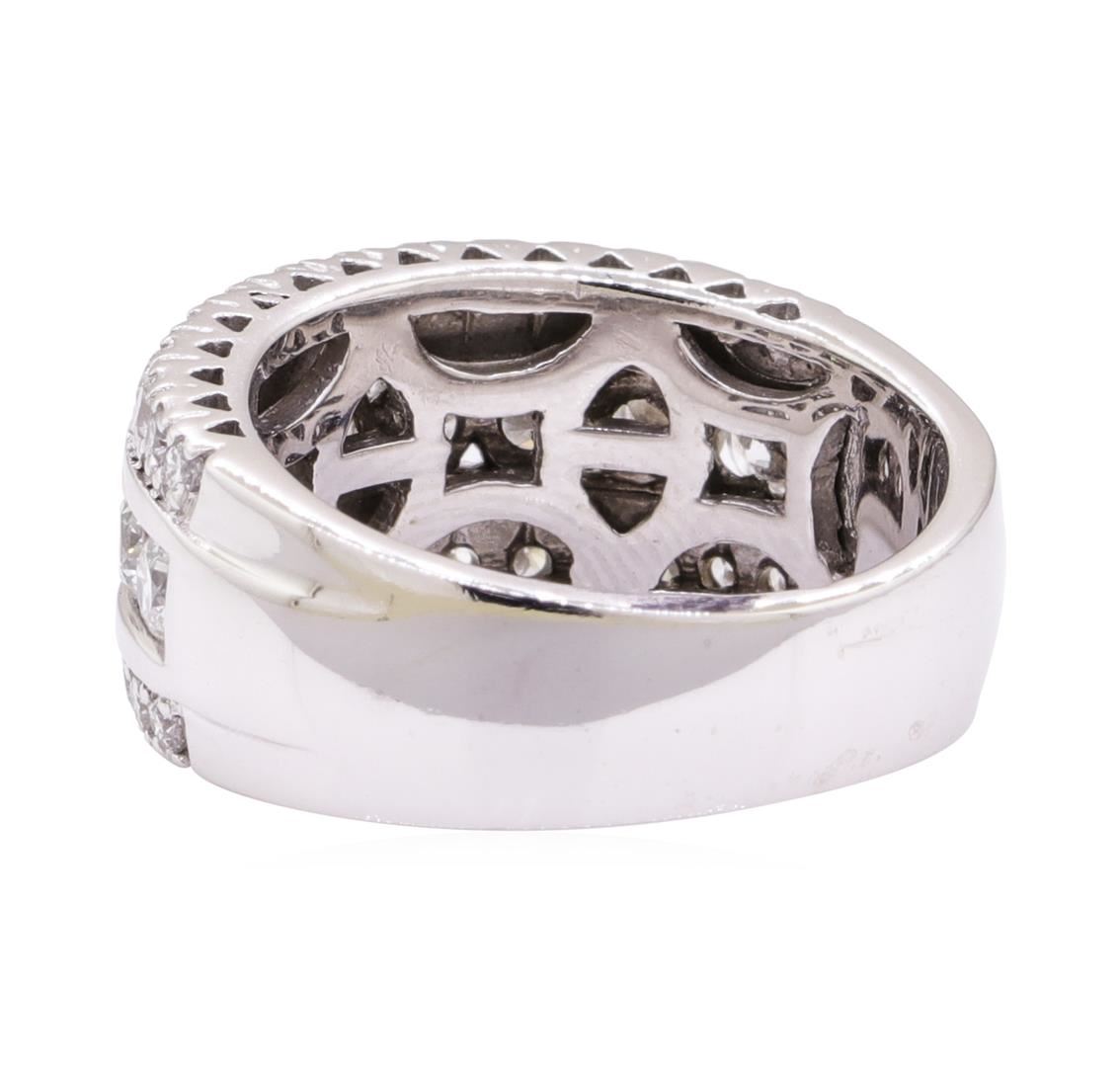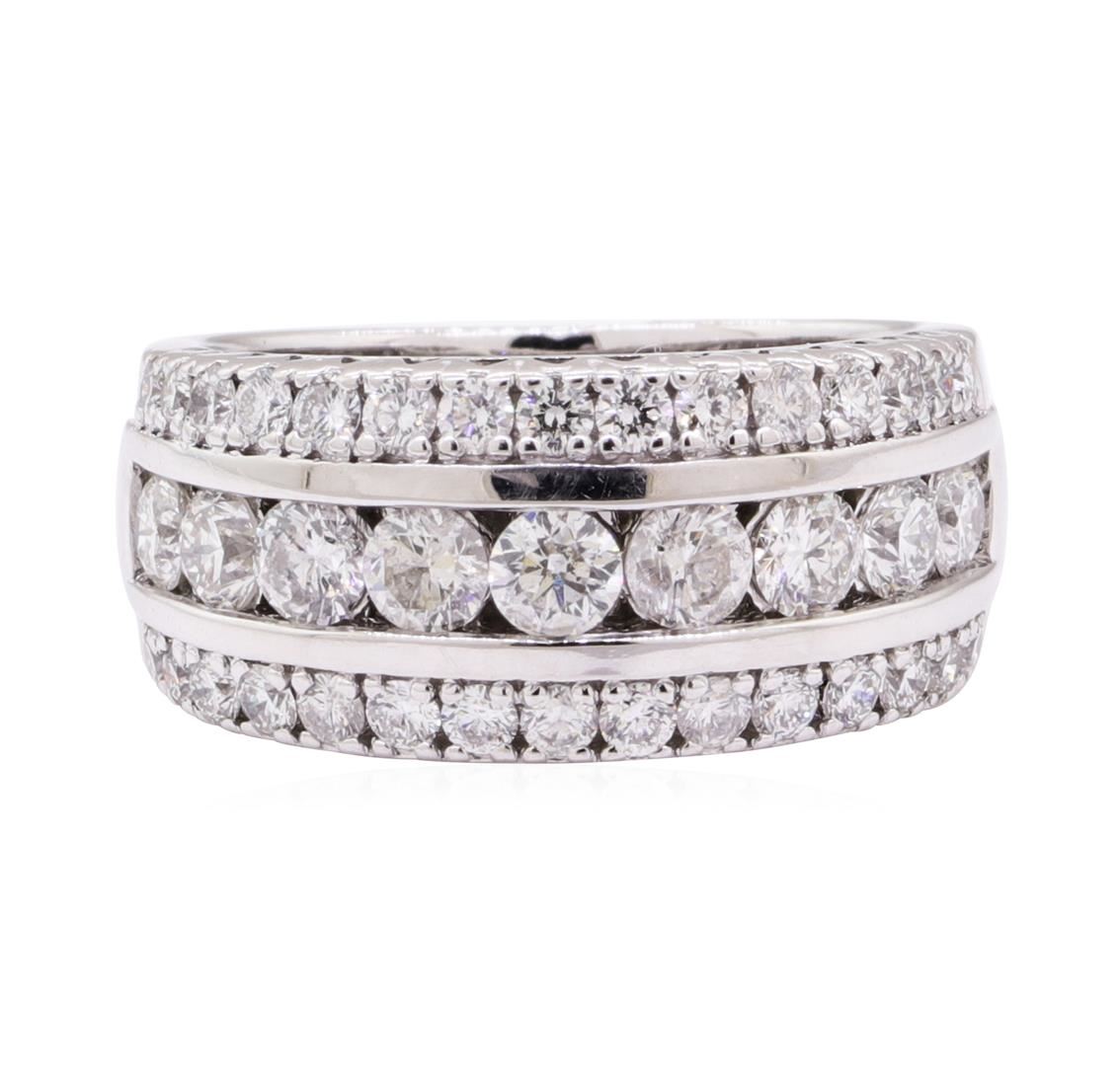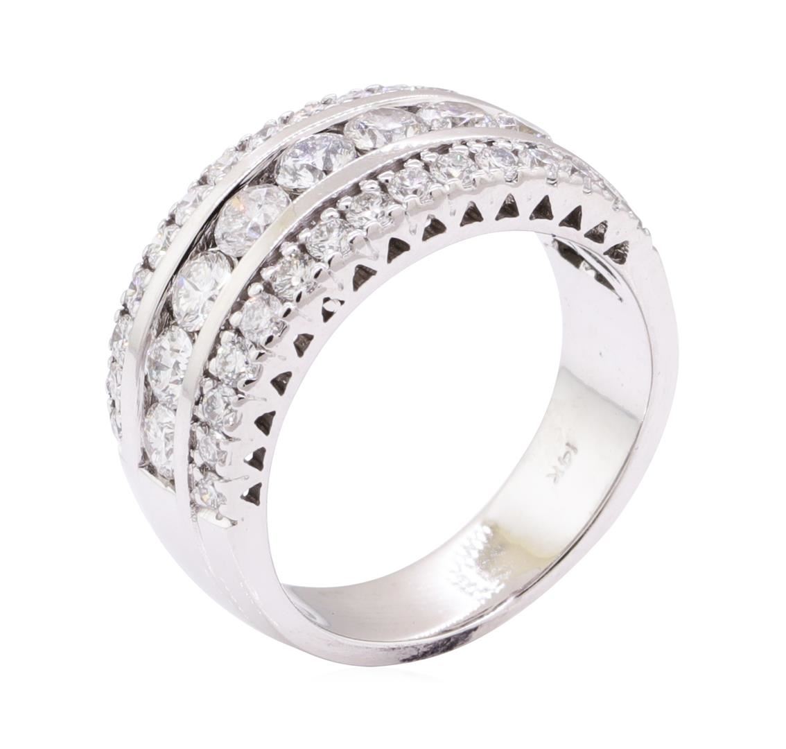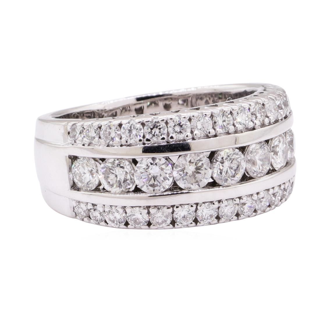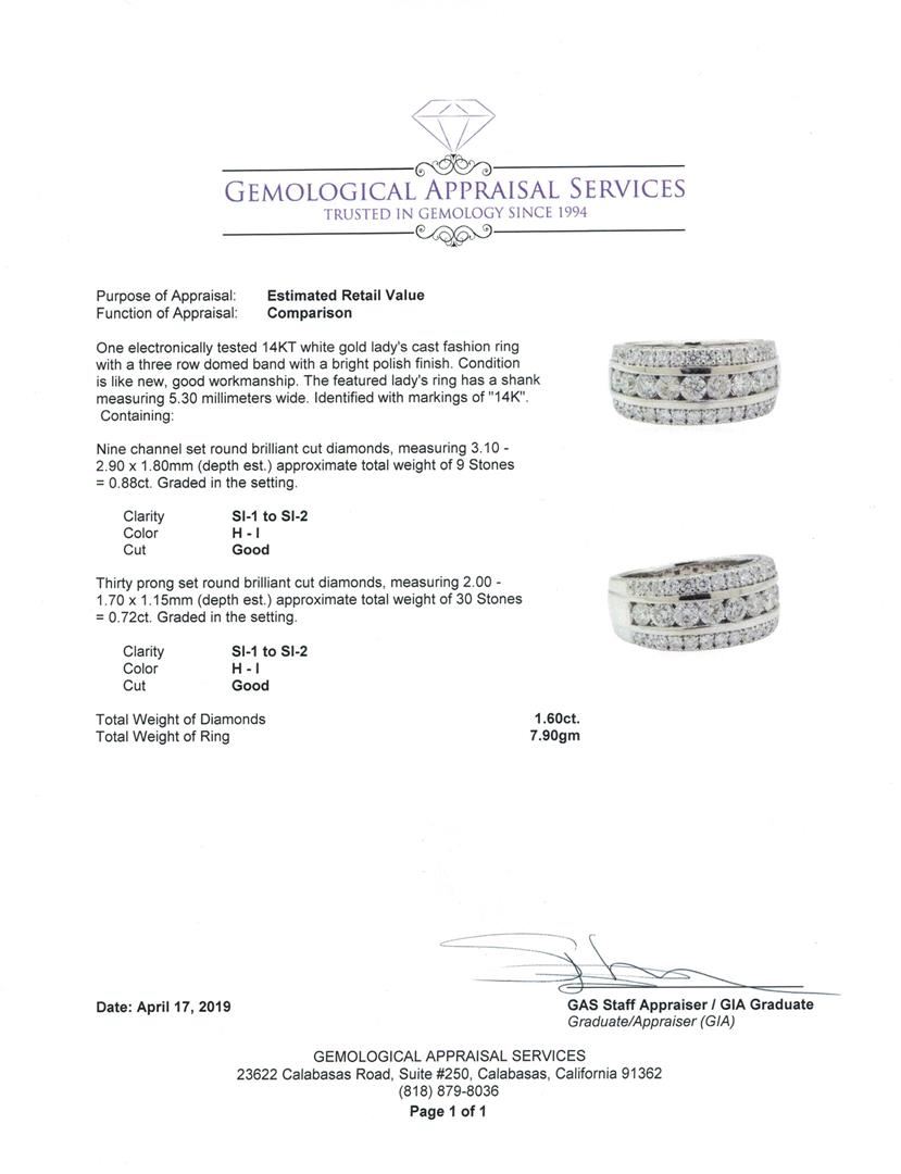 One electronically tested 14KT white gold lady's cast fashion ring with a three row domed band with a bright polish finish. The featured lady's ring has a shank measuring 5.30 millimeters wide. Identified with markings of '14K'. Condition is like new, good workmanship. Containing: Nine channel set round brilliant cut diamonds, measuring 3.10 - 2.90 x 1.80mm (depth est.) approximate total weight of 9 Stones = 0.88ct. Graded in the setting. Color H - I Clarity SI-1 to SI-2 Cut Good Thirty prong set round brilliant cut diamonds, measuring 2.00 - 1.70 x 1.15mm (depth est.) approximate total weight of 30 Stones = 0.72ct. Graded in the setting. Color H - I Clarity SI-1 to SI-2 Cut Good. Total Weight of Diamonds 1.60ct.. Total Weight of Ring 7.90gm GAS Appraised at $4810.00. GAS Appraised at $4,810.00.