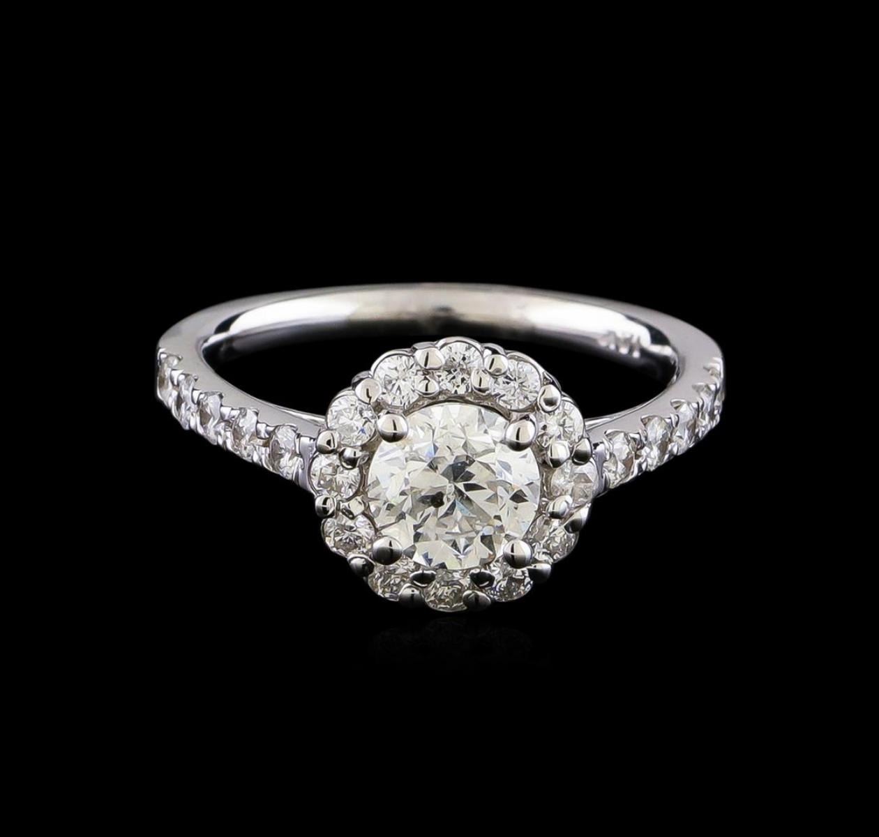 One electronically tested 14KT white gold lady's cast wedding ring with a cathedral halo with a bright polish finish. The featured lady's ring has a shank measuring 1.92 millimeters in width. Identified with markings of "14K". Condition is new, good workmanship. Containing: One prong set round brilliant cut diamond, measuring 6.17 - 6.13 x 4.04mm (depth est.) , 5.00.%. GTCF approximate weight of 1.00ct. Graded in the setting. Clarity: I-1. Color: G - Very Good Ten prong set round brilliant cut diamonds, measuring 2.00 - 1.95 x 1.25mm (depth est.) approximate total weight of 10 Stones = 0.30ct. Graded in the setting. Clarity: SI-1 to SI-2. Color: H - I. Cut Good Twelve prong set round brilliant cut diamonds, measuring 1.90 - 1.85 x 1.15mm (depth est.) approximate total weight of 12 Stones = 0.30ct. Graded in the setting. Clarity: SI-1 to I-1. Color: H - I. Cut Good. Total Weight of Diamonds 1.60ct. Total Weight of Ring 3.70gm. GAS Appraised.