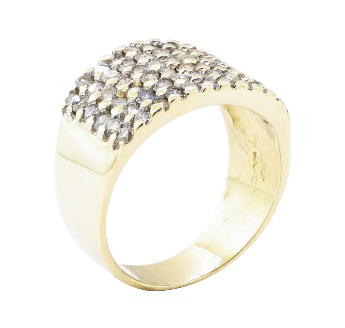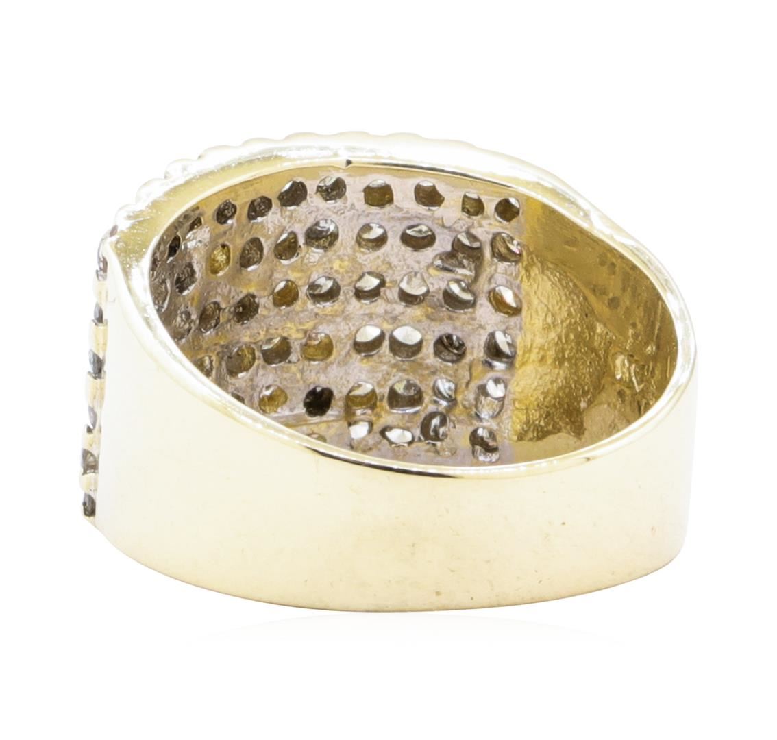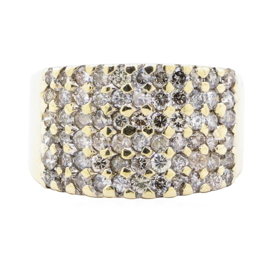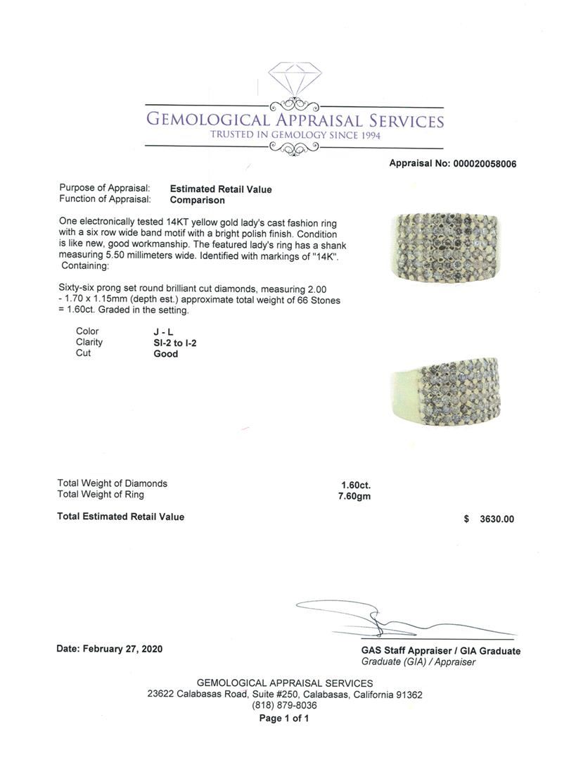 One electronically tested 14KT yellow gold lady's cast fashion ring with a six row wide band motif with a bright polish finish. The featured lady's ring has a shank measuring 5.50 millimeters wide. Identified with markings of '14K'. Condition is Good. Containing: Sixty-Six prong set round brilliant cut diamonds, measuring 2.00 - 1.70 x 1.15mm (depth est.) approximate total weight of 66 Stones = 1.60ct. Graded in the setting. Color J - L Clarity SI-2 to I-2 Cut Good. Total Weight of Diamonds 1.60ct.. Total Weight of Ring 7.60gm GAS Appraised at $3630.00. GAS Appraised at $3,630.00.