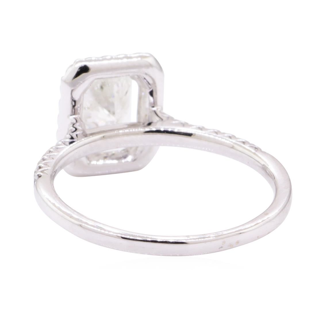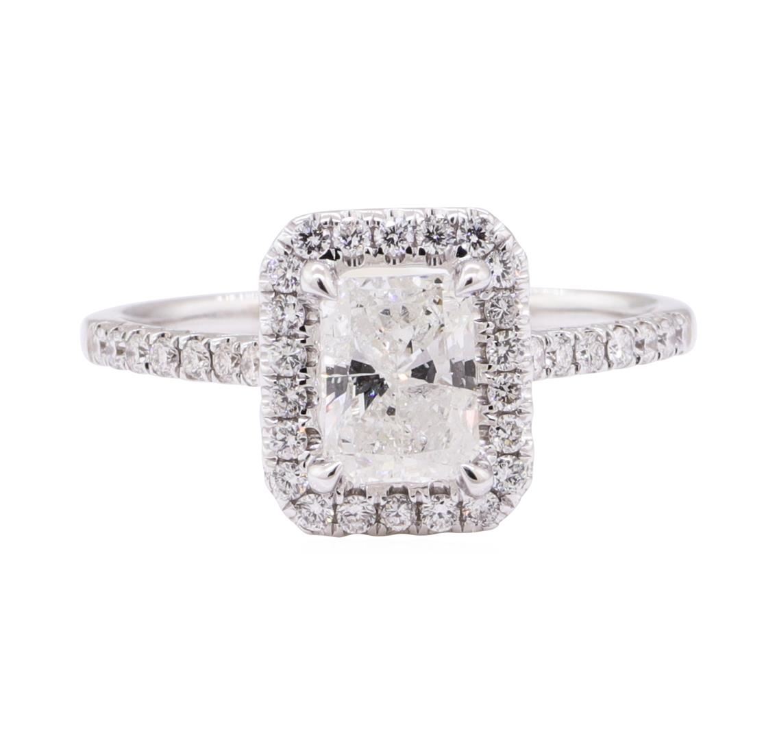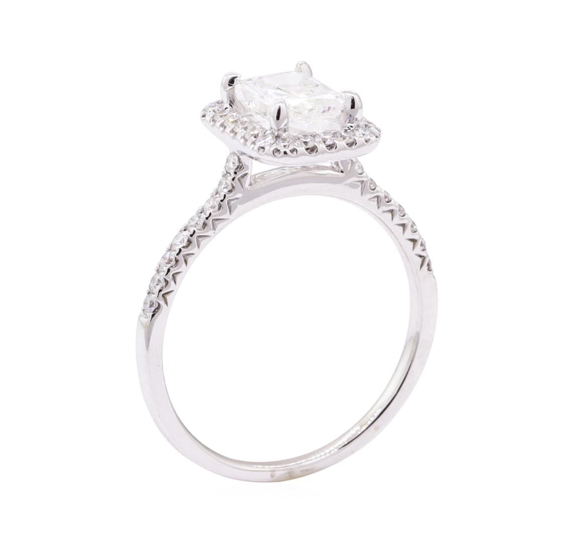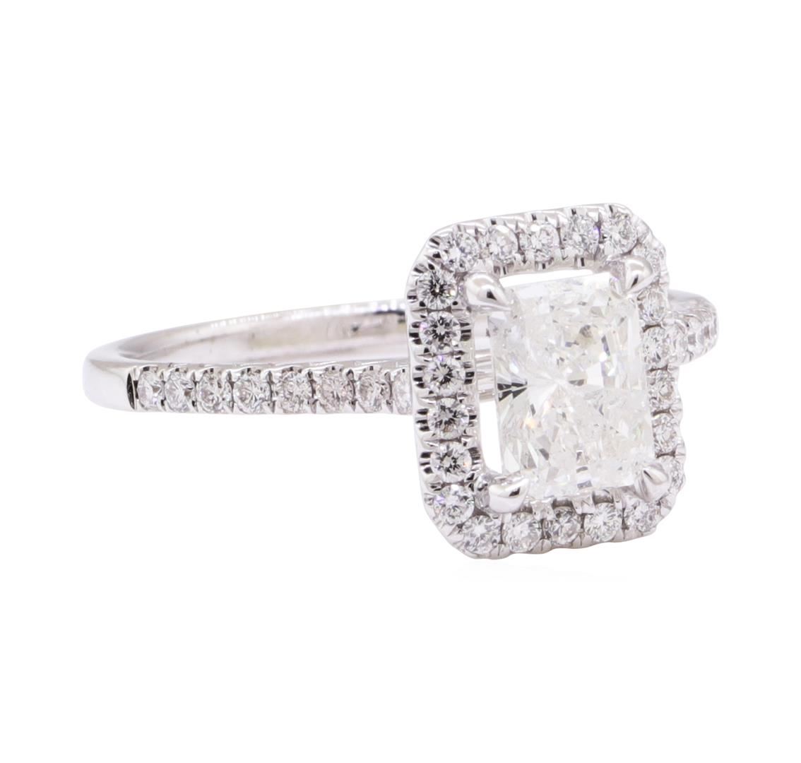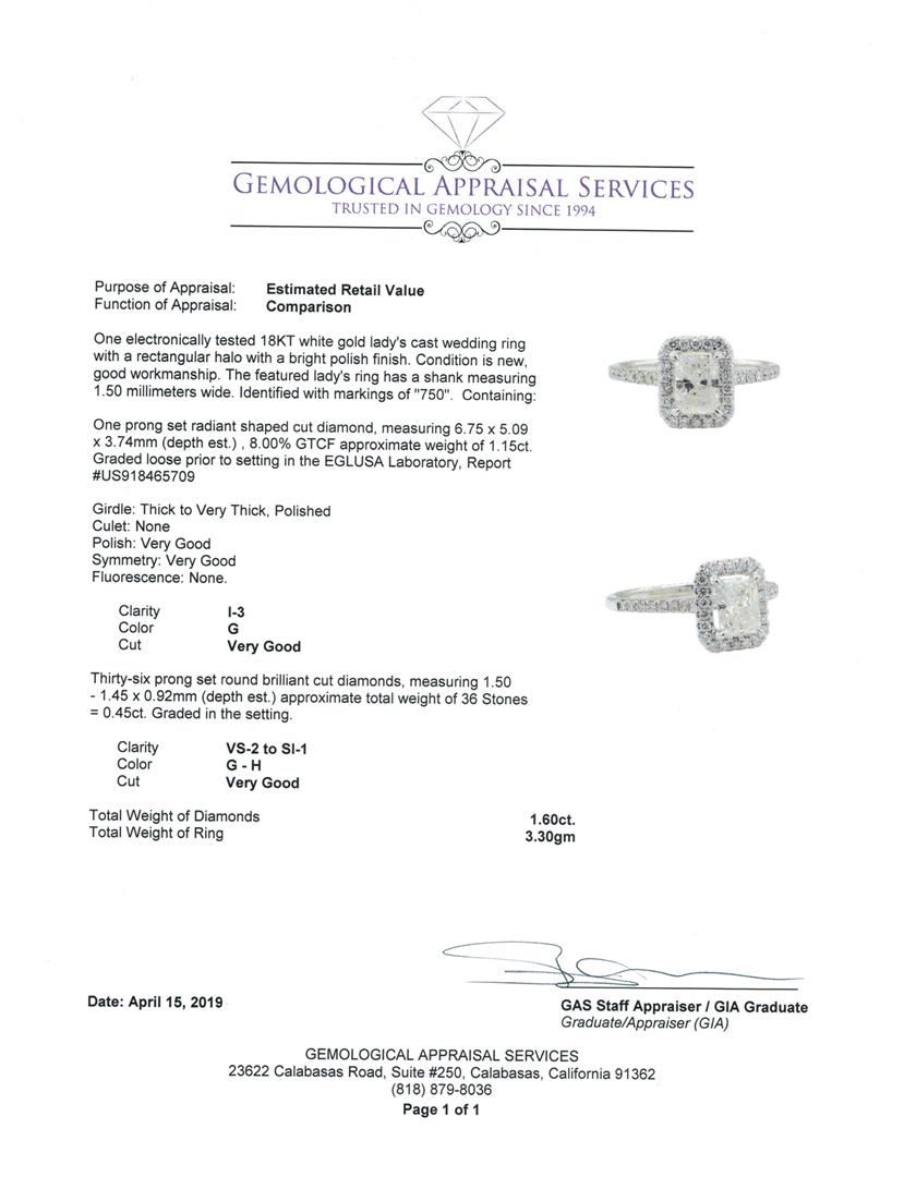 One electronically tested 18KT white gold lady's cast wedding ring with a rectangular halo with a bright polish finish. The featured lady's ring has a shank measuring 1.50 millimeters wide. Identified with markings of '750'. Condition is new, good workmanship. Containing: One prong set radiant shaped cut diamond, measuring 6.75 x 5.09 x 3.74mm (depth est.) , 8.00.%. GTCF approximate weight of 1.15ct. Graded loose prior to setting in the EGLUSA Laboratory, Report #US918465709Girdle: Thick to Very Thick, PolishedCulet: NonePolish: Very GoodSymmetry: Very GoodFluorescence: None. Color G Clarity I-3 Cut Very Good Thirty-Six prong set round brilliant cut diamonds, measuring 1.50 - 1.45 x 0.92mm (depth est.) approximate total weight of 36 Stones = 0.45ct. Graded in the setting. Color G - H Clarity VS-2 to SI-1 Cut Very Good. Total Weight of Diamonds 1.60ct.. Total Weight of Ring 3.30gm GAS Appraised at $5605.00. GAS Appraised at $5,605.00.