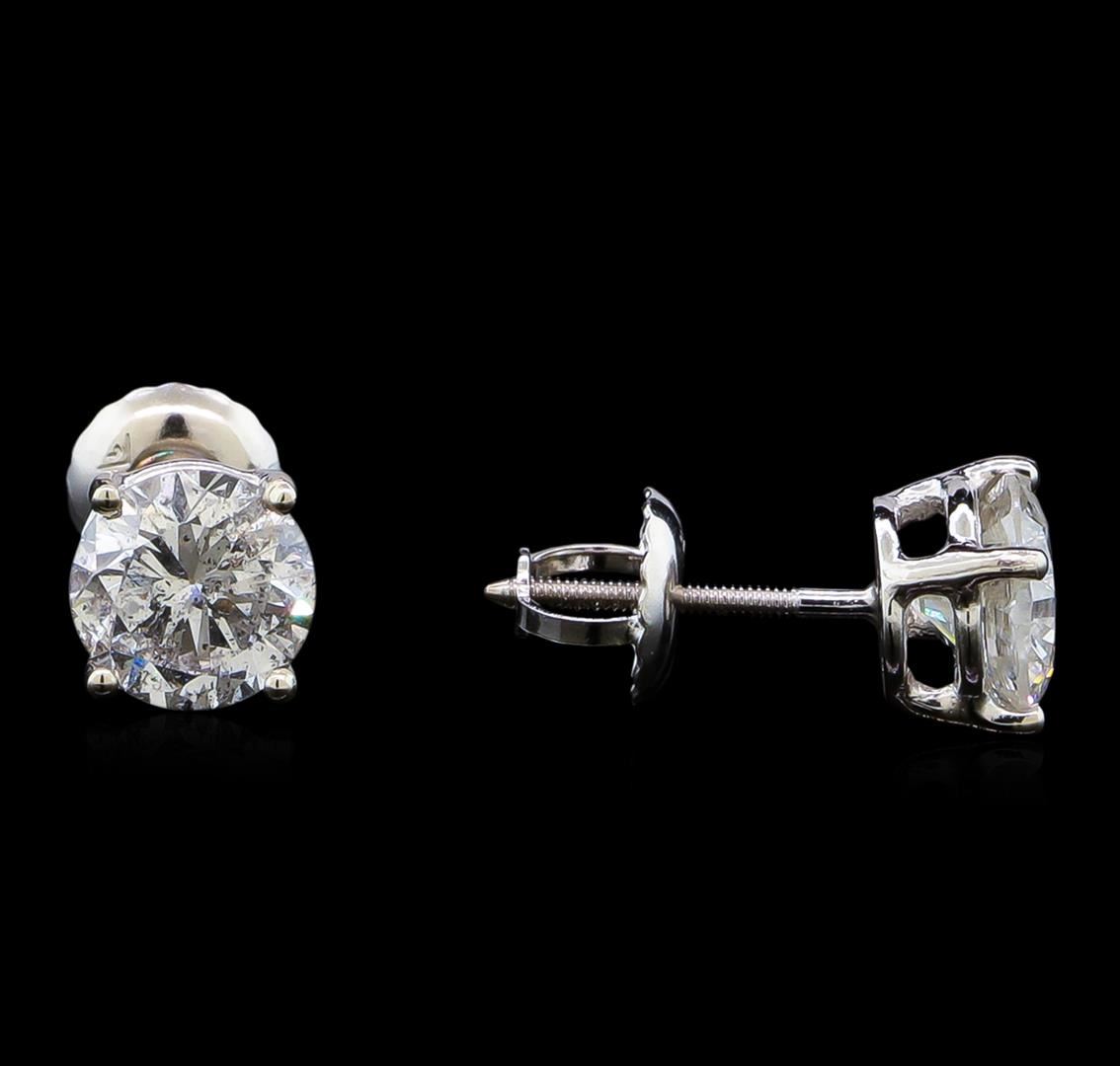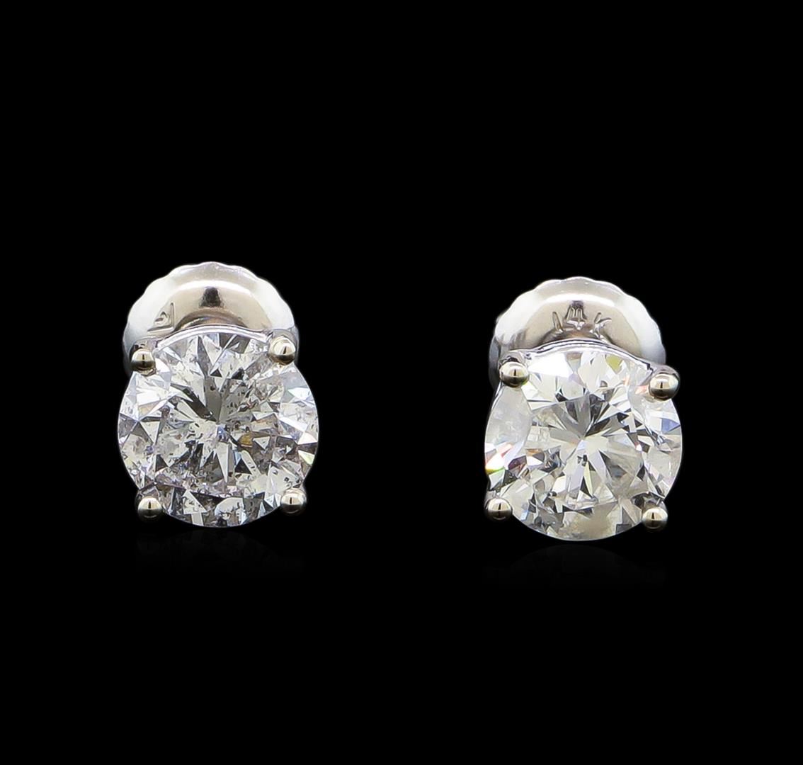 One pair electronically tested 14KT white gold lady's combination cast & assembled diamond stud earrings with threaded posts and screw-on/screw-off backs with a basket setting with a bright polish finish. Identified with markings of "14K". Condition is new, good workmanship. Containing: One prong set round brilliant cut diamond, measuring 6.00 - 5.98 x 3.77mm (depth est.) approximate weight of 0.82ct. Graded in the setting. Clarity: I-1. Color: Good One prong set round brilliant cut diamond, measuring 5.98 - 5.96 x 3.64mm (depth est.) approximate weight of 0.78ct. Graded in the setting. Clarity: SI-3. Color: G - Good. Total Weight of Diamonds 1.60ct. Total Weight of Stud Earrings 1.30gm. GAS Appraised at $10,750.00.