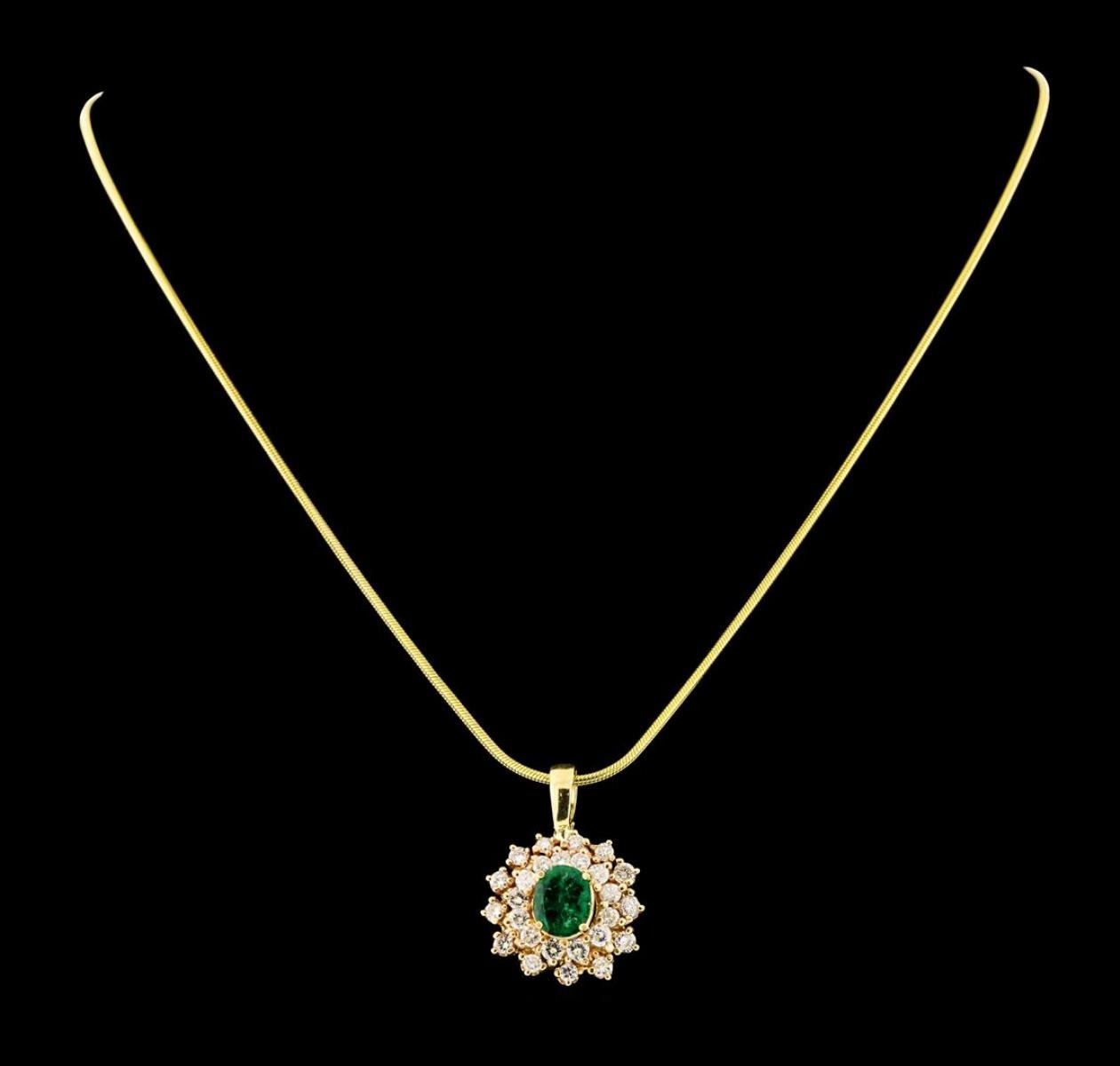 One electronically tested 14KT yellow and rose gold lady's combination cast & assembled fashion pendant & chain 18.0' long, 1.4mm round snake chain with a lobster claw clasp with a staggered double basket halo with a bright polish finish. The featured lady's pendant has a hinged bail with a foldover clasp and locking safety. Identified with markings of '14K'. Condition is new, good workmanship. Containing: One prong set oval modified mixed cut natural emerald, measuring 9.00 x 7.03 x 4.07mm, (depth est.) 5%. bulge factor, approximate weight of 1.60ct., clarity is heavily included, medium, very slightly grayish, green color, (GIA G 5/3), cut is good. Transmitting light somewhat diffusely, semi-transparent to translucent. Indications of oil residue. Naturally occurring internal & external characteristics are present. Colored gemstones are presumed to have been subjected to commonly used enhancement processes. Graded in the setting. Twenty-Six prong set round brilliant cut diamonds, measuring 2.70 - 2.50 x 1.61mm (depth est.) approximate total weight of 26 Stones = 1.75ct. Graded in the setting. Clarity SI-1 to I-1. Color: H - I Cut Good. Total Weight of Colored Stones 1.60ct.. Total Weight of Diamonds 1.75ct.. Total Weight of Pendant & Chain 13.10gm. GAS Appraised.
