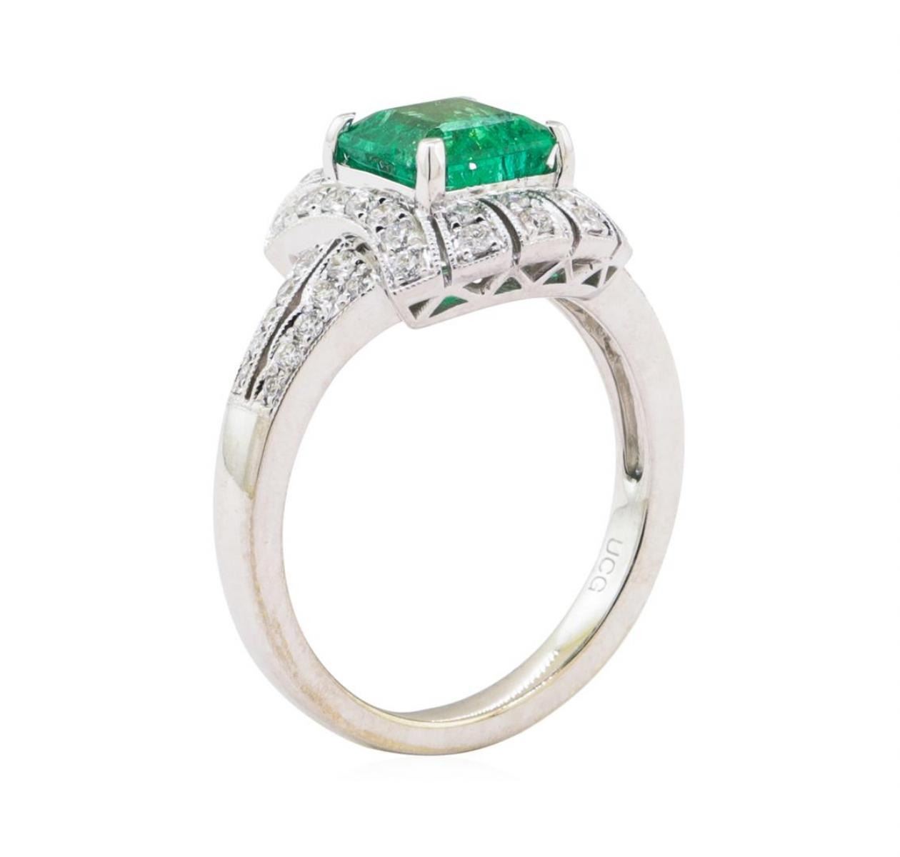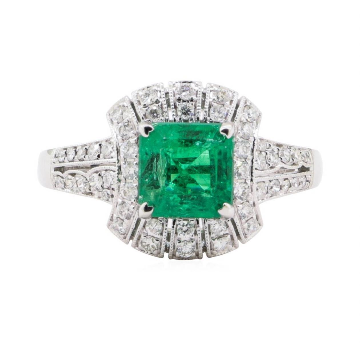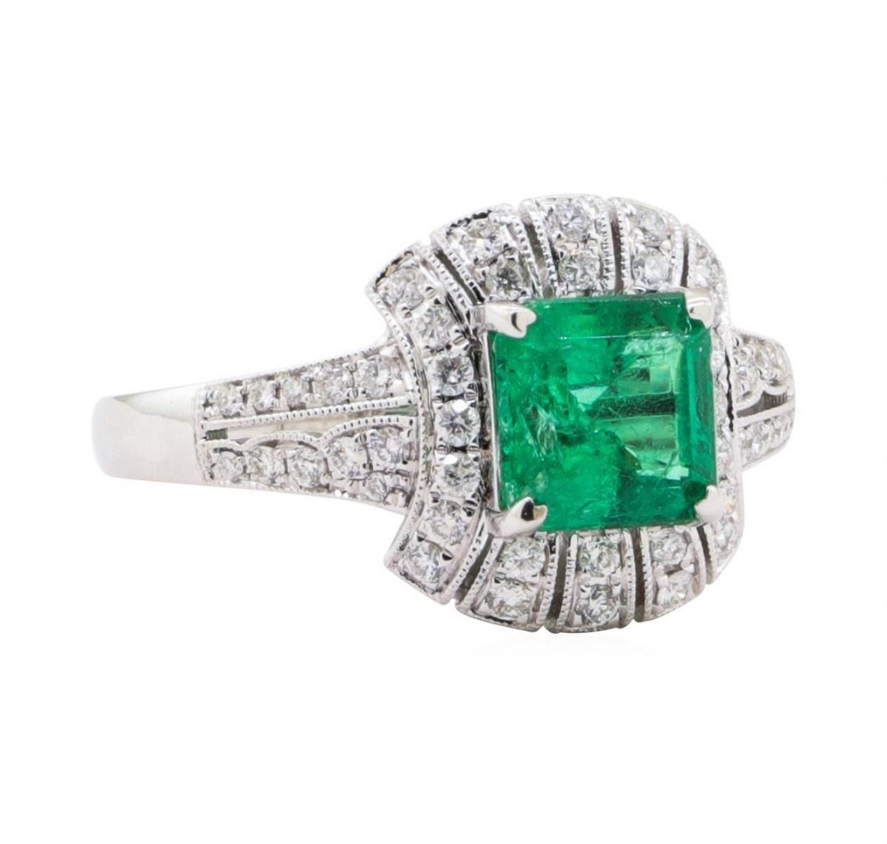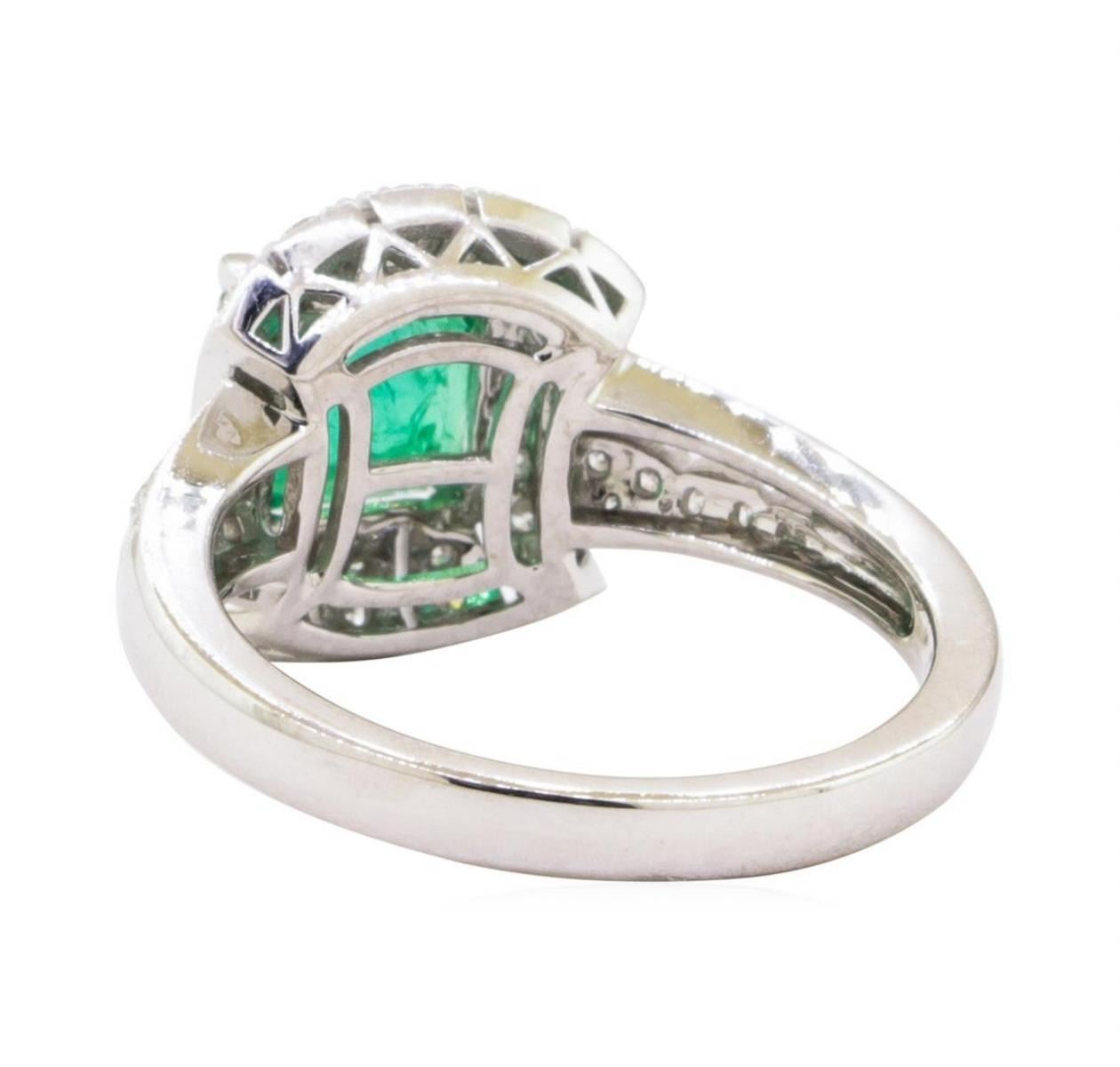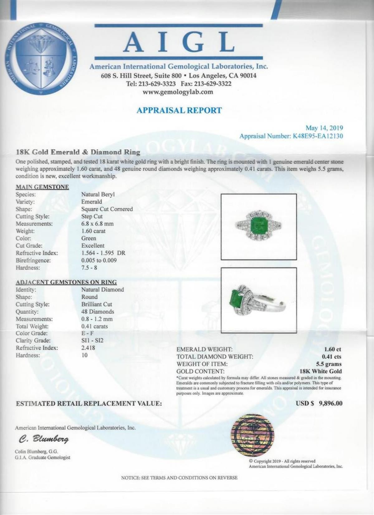 One polished, stamped, and tested 18 karat white gold ring with a bright ?nish. The ring is mounted with 1 genuine emerald center stone weighing approximately 1.60 carat, and 48 genuine round diamonds weighing approximately 0.41 carats. This item weighs 5.5 grams, condition is new, excellent workmanship. MAIN GEMSTONE Species: Natural Beryl Variety: Emerald Shape: Square Cut Cornered Cutting Style: Step Cut Measurements: 6.8 X 6.8 mm Weight: 1.60 carat Color: Green Cut Grade: Excellent Refractive Index: 1.564 -1.595 DR Birefringence: 0.005 to 0.009 Hardness: 7.5 - 8 ADJACENT GEMSTONES ON RING Identity: Natural Diamond Shape: Round Cutting Style: Brilliant Cut Quantity: 48 Diamonds Measurements: 0.8 - 1.2 mm Total Weight: 0.41 carats Color Grade: E - F Clarity Grade: SI1 - SI2 Refractive Index: 2.418 Hardness: 10 EMERALD WEIGHT: 1.60 ct TOTAL DIAMOND WEIGHT: 0.41 cts WEIGHT OF ITEM: 5.5 grams GOLD CONTENT: 18K White Gold ESTIMATED RETAIL REPLACEMENT VALUE: USD $ 9,896.00