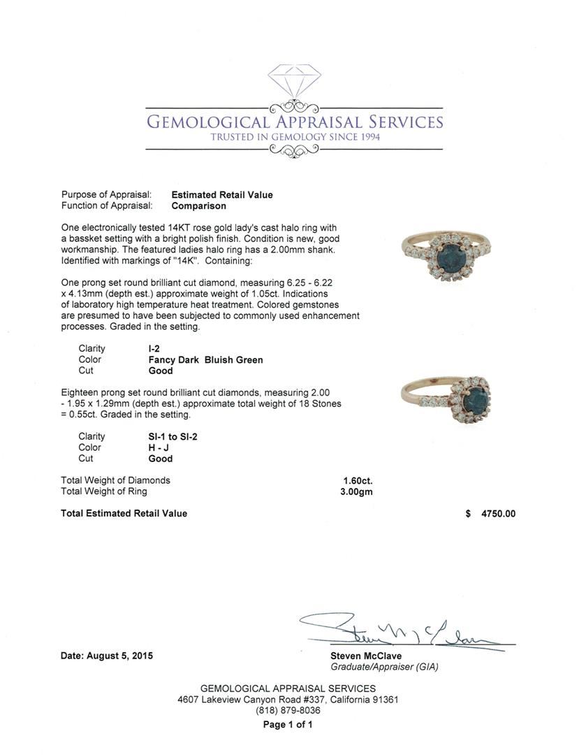 One electronically tested 14KT rose gold lady's cast halo ring with a basket setting with a bright polish finish. The featured ladies halo ring has a 2.00mm shank. Identified with markings of "14K". Condition is new, good workmanship. Containing: One prong set round brilliant cut diamond, measuring 6.25 - 6.22 x 4.13mm (depth est.) approximate weight of 1.05ct. Indications of laboratory high temperature heat treatment. Colored gemstones are presumed to have been subjected to commonly used enhancement processes. Graded in the setting. Clarity: I-2 Cut Good Eighteen prong set round brilliant cut diamonds, measuring 2.00 - 1.95 x 1.29mm (depth est.) approximate. Total Weight of 18 Stones = 0.55ct. Graded in the setting. Clarity: SI-1 to SI-2. Color: H - Good. Total Weight of Diamonds 1.60ct. Total Weight of Ring 3.00gm. GAS Appraised at $4,750.00.