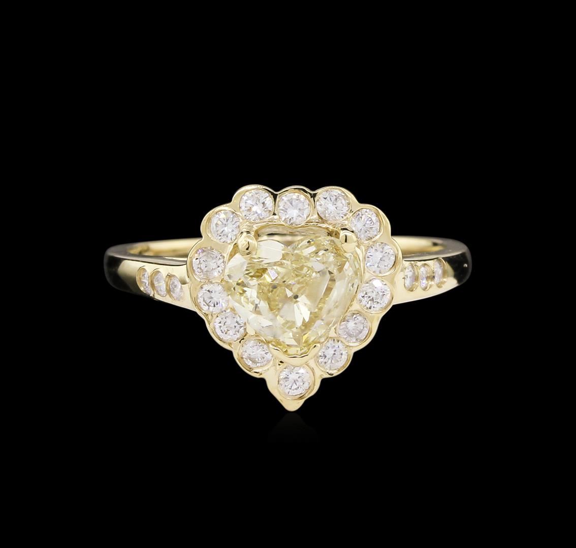 One electronically tested 14KT yellow gold lady's cast fashion ring with a cathedral shank with a bright polish finish. The featured lady's ring has a shank measuring 1.19 millimeters wide. Identified with markings of "K14". Condition is new, good workmanship. Containing: One prong set heart shaped cut diamond, measuring 6.30 x 7.03 x 3.79mm (depth est.) , 20.00% GTCF approximate weight of 1.24ct. Graded in the setting. Clarity: I-1 Cut Very Good Fourteen bezel set round brilliant cut diamonds, measuring 1.80 - 1.70 x 1.07mm (depth est.) approximate total weight of 14 Stones = 0.28ct. Graded in the setting. Clarity: SI-1 to SI-2. Color: G - Good Six bezel set round brilliant cut diamonds, measuring 1.50 - 1.45 x 0.95mm (depth est.) approximate total weight of 6 Stones = 0.08ct. Graded in the setting. Clarity: SI-1 to SI-2. Color: G - Good. Total Weight of Diamonds 1.60ct. Total Weight of Ring 3.20gm. GAS Appraised at $10,575.00.