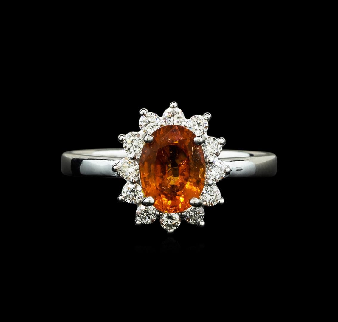 One electronically tested 14KT white gold lady's cast fashion ring with a basket halo with a bright polish finish. The featured lady's ring has a shank measuring 1.97 millimeters wide. Identified with markings of '14K'. Condition is new, good workmanship. Containing: One prong set oval modified brilliant cut natural mandarin spessartite, measuring 7.82 x 5.84 x 3.73mm, (depth est.) 7%. bulge factor, approximate weight of 1.60ct., clarity is slightly included, medium, brownish, orange color, (GIA O 5/3), cut is good. Transmitting light with a minimum of distortion, transparent. Colored gemstones are presumed to have been subjected to commonly used enhancement processes. Graded in the setting. Twelve prong set round brilliant cut diamonds, measuring 2.00 - 1.90 x 1.21mm (depth est.) approximate total weight of 12 Stones = 0.34ct. Graded in the setting. Clarity VS-2 to SI-1. Color: G - H Cut Very Good. Total Weight of Colored Stones 1.60ct.. Total Weight of Diamonds 0.34ct.. Total Weight of Ring 3.10gm GAS Appraised at $3,235.00.