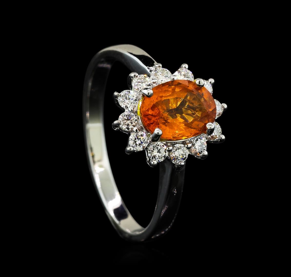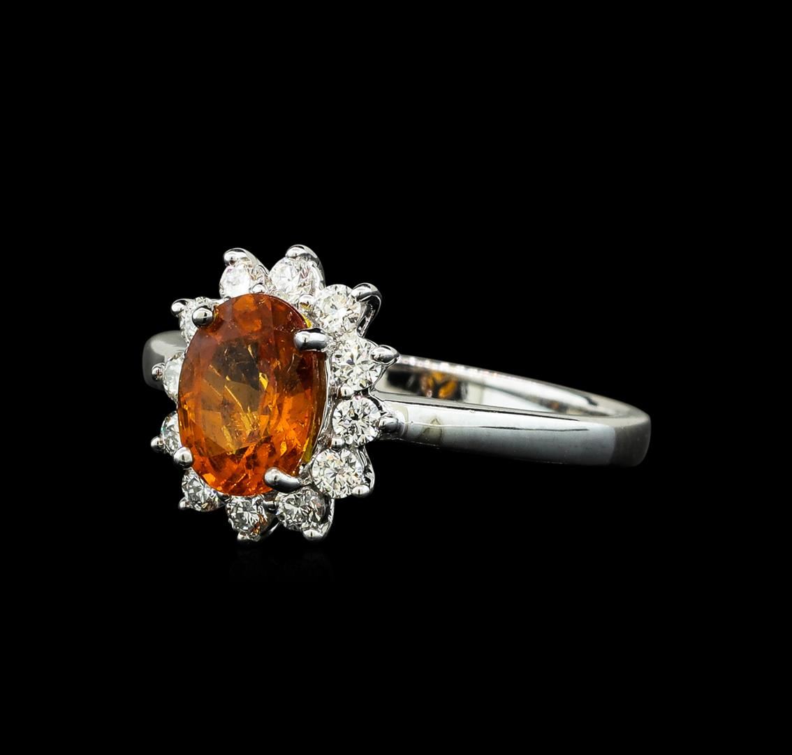 One electronically tested 14KT white gold lady's cast fashion ring with a basket halo with a bright polish finish. The featured lady's ring has a shank measuring 1.97 millimeters wide. Identified with markings of '14K'. Condition is new, good workmanship. Containing: One prong set oval modified brilliant cut natural mandarin spessartite, measuring 7.82 x 5.84 x 3.73mm, (depth est.) 7%. bulge factor, approximate weight of 1.60ct., clarity is slightly included, medium, brownish, orange color, (GIA O 5/3), cut is good. Transmitting light with a minimum of distortion, transparent. Colored gemstones are presumed to have been subjected to commonly used enhancement processes. Graded in the setting. Twelve prong set round brilliant cut diamonds, measuring 2.00 - 1.90 x 1.21mm (depth est.) approximate total weight of 12 Stones = 0.34ct. Graded in the setting. Clarity VS-2 to SI-1. Color: G - H Cut Very Good. Total Weight of Colored Stones 1.60ct.. Total Weight of Diamonds 0.34ct.. Total Weight of Ring 3.10gm GAS Appraised at $3,235.00.