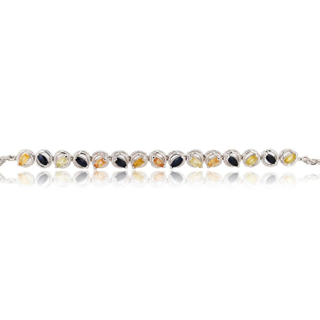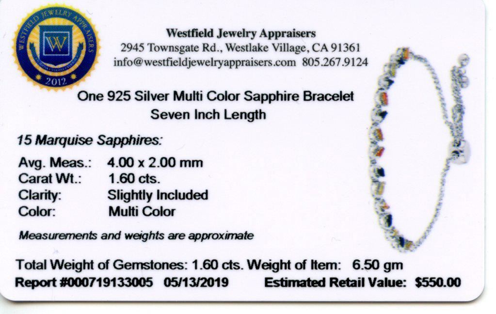 One electronically tested sterling Silver ladies cast and assembled multi color sapphire bracelet. 7 adjustable inch length. Fifteen prong set round marquise cut natural multi color sapphires, measuring 4.00 x 2.00 x 0.00mm, stated total weight of 1.60ct