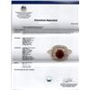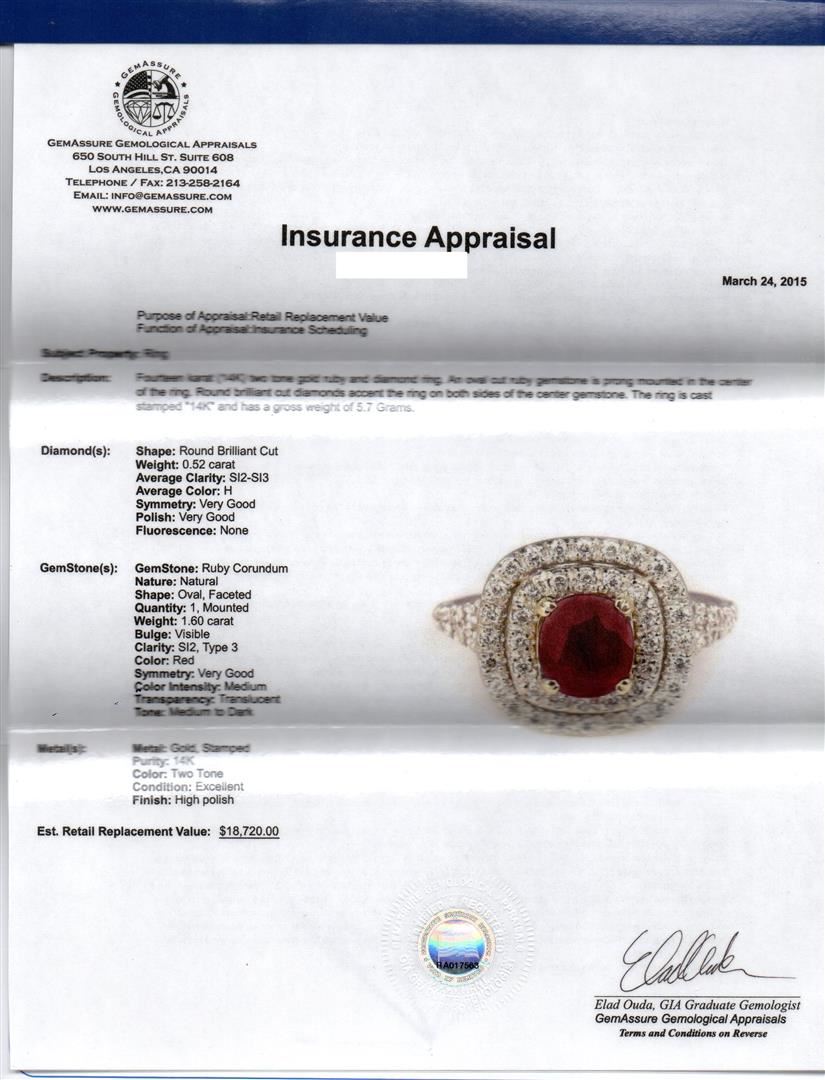Fourteen karat (14K) two tone gold ruby and diamond ring. An oval cut ruby gemstone is prong mounted in the center of the ring. Round brilliant cut diamonds accent the ring on both sides of the center gemstone. The ring is cast stamped "14K" and has a gross weight of 5.7 Grams. Diamond(s): Shape: Round Brilliant Cut. Weight: 0.52 carat. Average Clarity: SI2-SI3. Average Color: H. Symmetry: Very Good. Polish: Very Good. Fluorescence: None. GemStone(s): GemStone: Ruby Corundum. Nature: Natural. Shape: Oval, Faceted. Quantity: 1, Mounted. Weight: 1.60 carat. Bulge: Visible. Clarity: SI2, Type 3. Color: Red. Symmetry: Very Good. Color Intensity: Medium. Transparency: Translucent. Tone: Medium to Dark. Metal(s): Metal: Gold, Stamped. Purity: 14K. Color: Two Tone. Condition: Excellent. Finish: High polish. GGA Appraised at $18,720.00.
