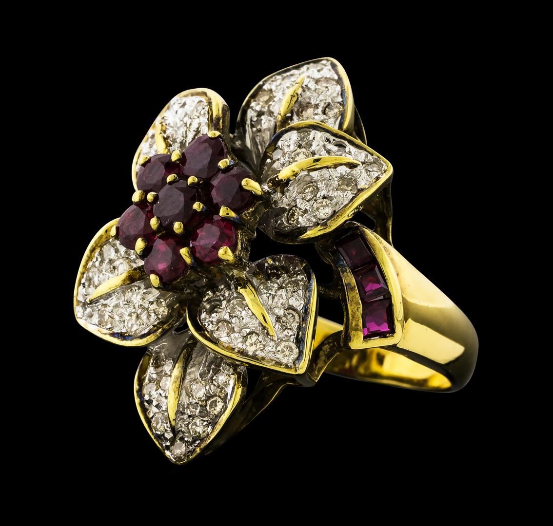One ring featuring: 18KT Yellow Gold containing Ruby with a total weight of 1.60ct and Diamonds with a total weight of 0.74ct. Total Weight of Ring: 12.3 grams.