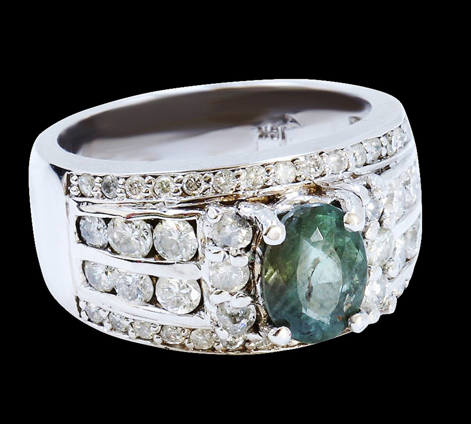 18K WHITE GOLD NATURAL ALEXANDRITE VERY GOOD COLOR CHANGE RING:10.44GRAMS/DIAMOND:1.53CT/ALEXANDRITE:1.60CT/#GVR1033 **Alexandrite have a vibrational connection to source energies of the higher dimensions where the atmosphere is most rapturous. Ardently crafted in 18k white gold, this elegant 1.60ct oval shape Alexandrite soothes with its blue green hue, like morning ocean mist. Surrounded by 1.53ct round brilliant cut Diamonds, this ring is an investment piece; the dazzling sparkle flickers like light beams shining off of the water.**