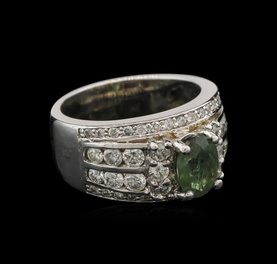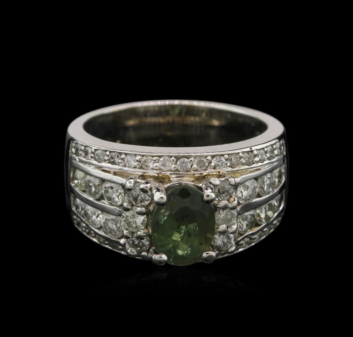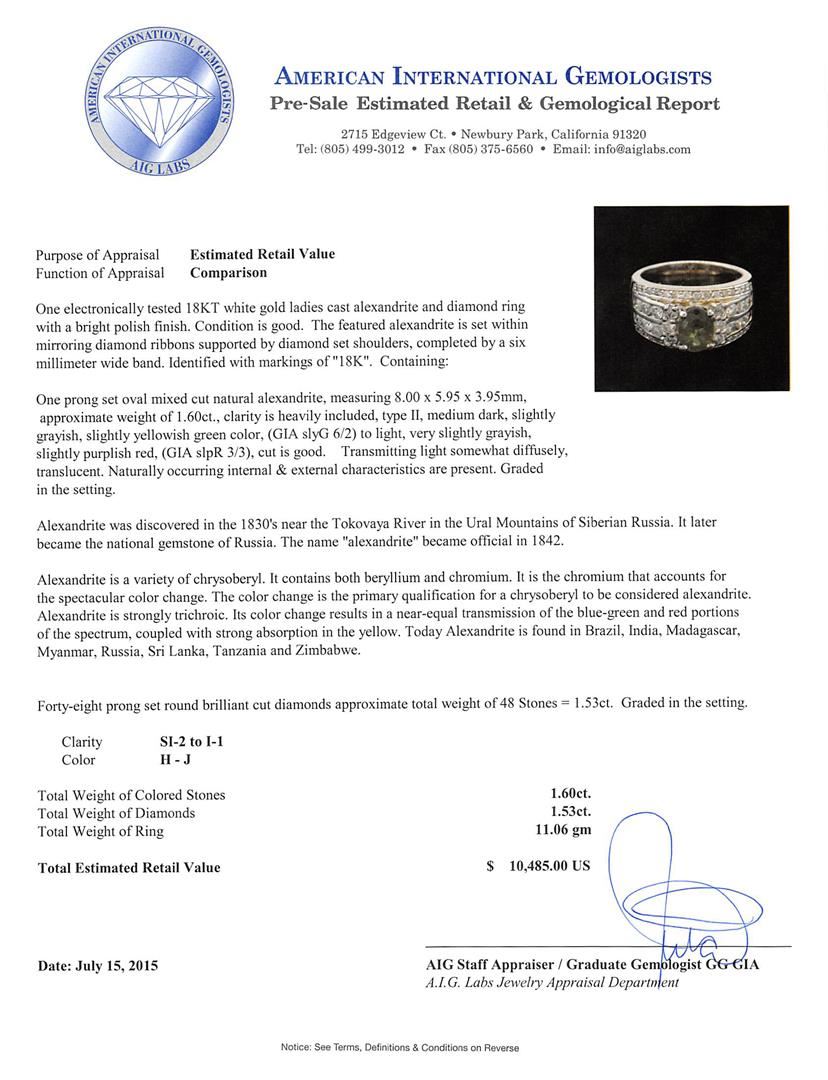 One electronically tested 18KT white gold ladies cast alexandrite and diamond ring with a bright polish finish. The featured alexandrite is set within mirroring diamond ribbons supported by diamond set shoulders, completed by a six millimeter wide band. Identified with markings of "18K". Condition is good. Containing: One prong set oval mixed cut natural alexandrite, measuring 8.00 x 5.95 x 3.95mm, approximate weight of 1.60ct., clarity is heavily included, type II, medium dark, slightly grayish, slightly yellowish green color, (GIA slyG 6/2) to light, very slightly grayish, slightly purplish red, (GIA slpR 3/3), cut is good. Transmitting light somewhat diffusely, translucent. Naturally occurring internal & external characteristics are present. Graded in the setting. Alexandrite was discovered in the 1830's near the Tokovaya River in the Ural Mountains of Siberian Russia. It later became the national gemstone of Russia. The name "alexandrite" became official in 1842.Alexandrite is a variety of chrysoberyl. It contains both beryllium and chromium. It is the chromium that accounts for the spectacular color change. The color change is the primary qualification for a chrysoberyl to be considered alexandrite. Alexandrite is strongly trichroic. Its color change results in a near-equal transmission of the blue-green and red portions of the spectrum, coupled with strong absorption in the yellow. Today Alexandrite is found in Brazil, India, Madagascar, Myanmar, Russia, Sri Lanka, Tanzania and Zimbabwe. Forty-Eight prong set round brilliant cut diamonds approximate total weight of 48 Stones = 1.53ct. Graded in the setting. Clarity: SI-2 to I-1. Color: H - J. Total Weight of Colored Stones 1.60ct. Total Weight of Diamonds 1.53ct. Total Weight of Ring 11.06gm. AIG Appraised at $10,485.00.