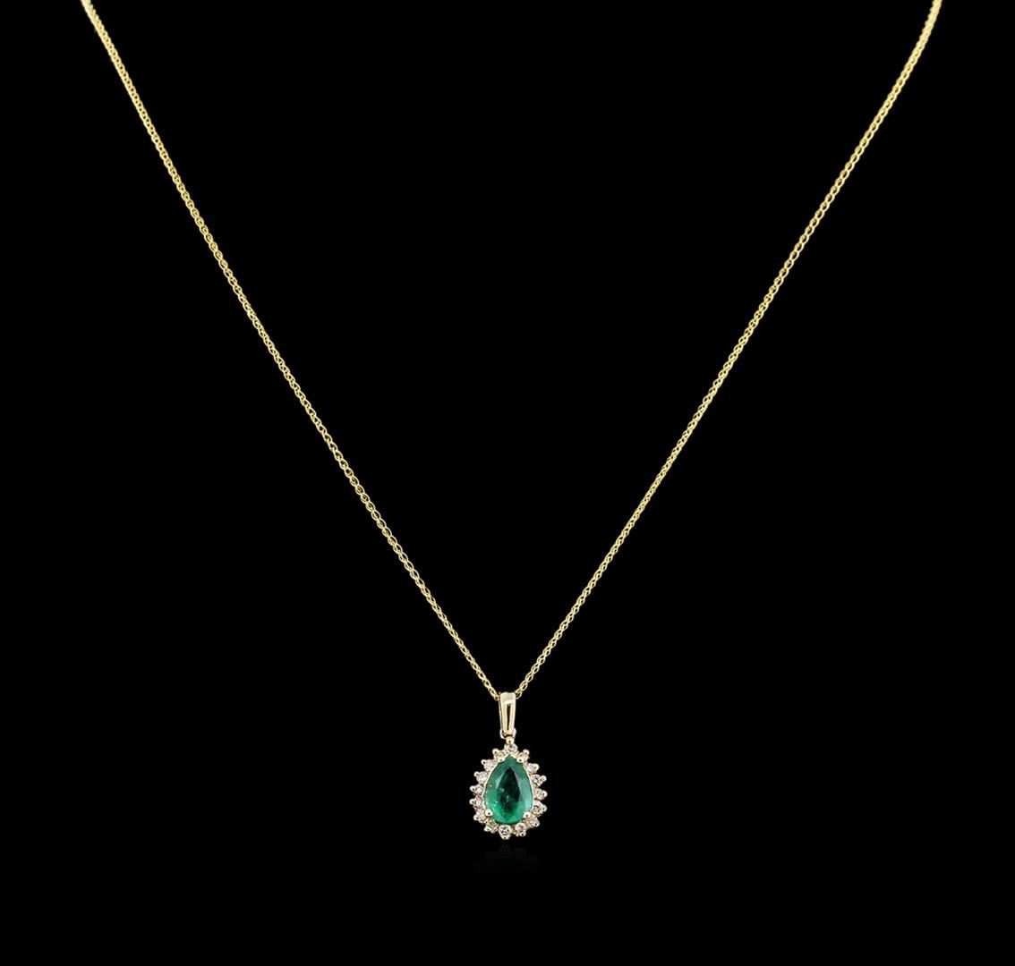 One electronically tested 14KT yellow gold lady's combination cast & assembled pendant & chain 18.0" long, 1 diamond cut loose rope with a spring ring clasp with a halo with a bright polish finish. Identified with markings of "14K". Condition is new, good workmanship. Containing: One prong set pear modified brilliant cut natural emerald, measuring 9.39 x 6.55 x 4.32mm, 10% bulge factor, approximate weight of 1.60ct., clarity is moderately included, type III, medium, very slightly grayish, very slightly bluish green color, (GIA vslbG 5/3), cut is good. Transmitting light somewhat diffusely, transparent to translucent. Colored gemstones are presumed to have been subjected to commonly used enhancement processes. Graded in the setting. Sixteen prong set round brilliant cut diamonds, measuring 1.70 - 1.65 x 1.09mm (depth est.) approximate total weight of 16 Stones = 0.30ct. Graded in the setting. Clarity: SI-1 to I-1. Color: H - Good. Total Weight of Colored Stones 1.60ct. Total Weight of Diamonds 0.30ct. Total Weight of Pendant & Chain 3.10gm. GAS Appraised at $2,580.00.